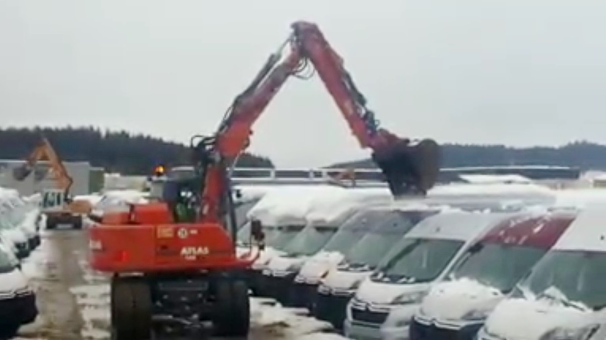 Именно с такой проблемой уборки снега с крыш фургонов Citroen Jumper cтолкнулись на одной дилерской площадке. Сотрудники не растерялись и решили использовать для этой цели… Только не удивляйтесь – два колесных экскаватора.