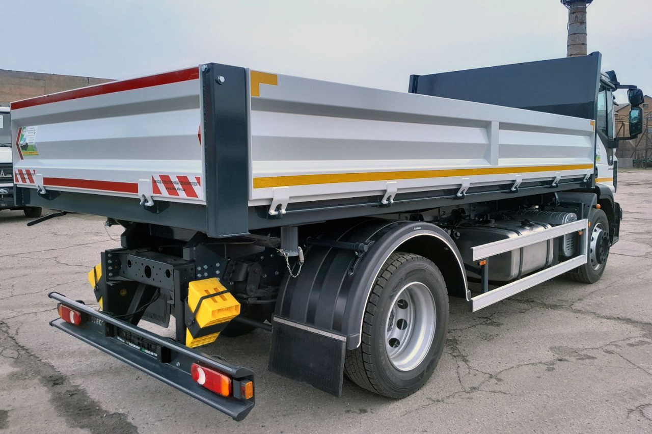 Кузов тристороннього розвантаження з висотою бортів 600 мм виготовлений зі сталі Strenx 700МС і рухається гідравлікою марки Hyva. Фурнітура використовується італійського виробництва. Корисний об’єм платформи складає 7,5 м куб. Самоскид має вантажопідйомність 10 т. Важливо, що у передній частині надбудови встановлений сталевий фартух, який захищає кабіну у разі зміщення вантажу.