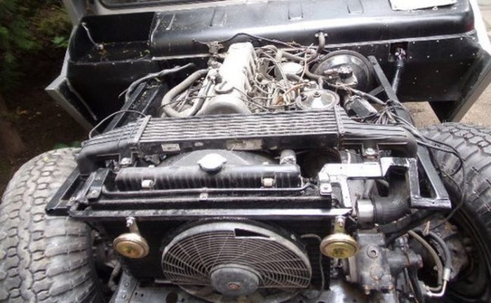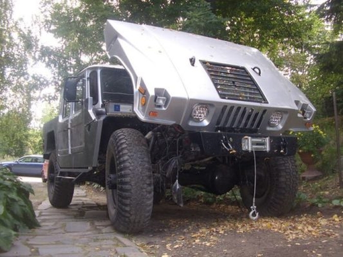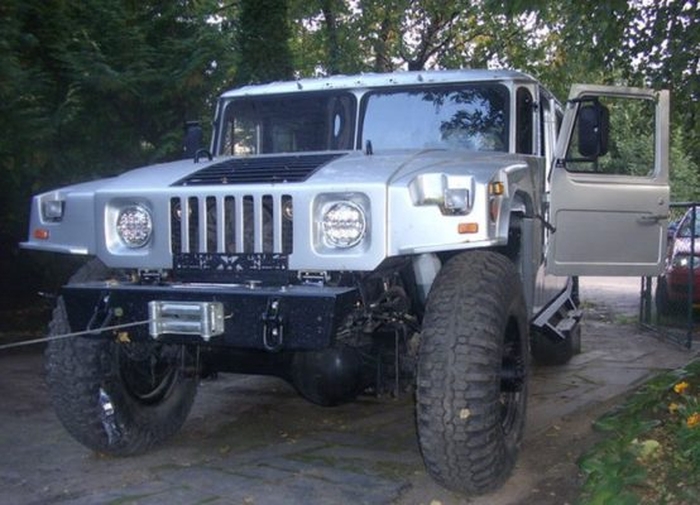 «Шишига» была основательно переделана. Кабину сделали двухрядной, 4-дверной, от еще одого донора. Установили «хаммеровский» капот и конечно же кузов с откидным бортом сзади – все как на настоящем Hummer. Старенький движок ГАЗ-66 был заменен на сердце с «трехлучевой звездой», то есть марки Mercedes-Benz.