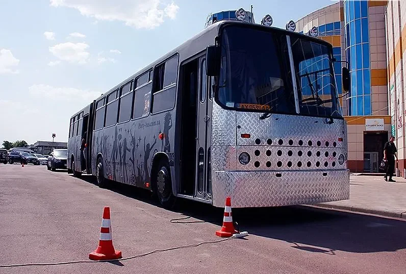Цей зчленований автобус, який сьогодні продають у Києві за 50 тис. доларів, називається Party Bus. Це справжній танцпол на колесах, який розрахований на 40 осіб, оснащений світломузикою, караоке та барною стійкою. У комплектацію також входять ліжко-трансформер, душ та туалет.
