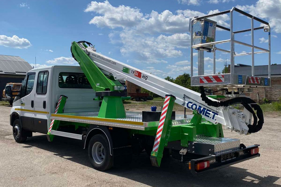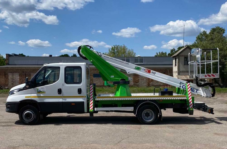 Сьогодні для відновлення критичної інфраструктури нашим енергетикам дуже потрібні спеціалізовані автомобілі, у тому числі автовишки. Така техніка продовжує активно закуповуватися для районів, що найбільш постраждали від російських обстрілів. Завод спецтехніки «Техкомплект» днями поставив на північ України один із найпопулярніших на вітчизняному ринку автогідропідйомників. Це відома італійська модель Comet 19-2-14-HQ, встановлена на шасі IVECO Daily із дворядною, семимісною кабіною.