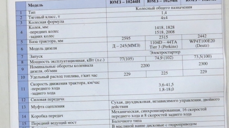 Все три модели имеют разные колесные базы. Так, у модели ЮМЗ-19264Н ее длина составляет 2442 мм, у ЮМЗ-10244Н – 2595 мм и ЮМЗ-10254Н – 2315 мм.