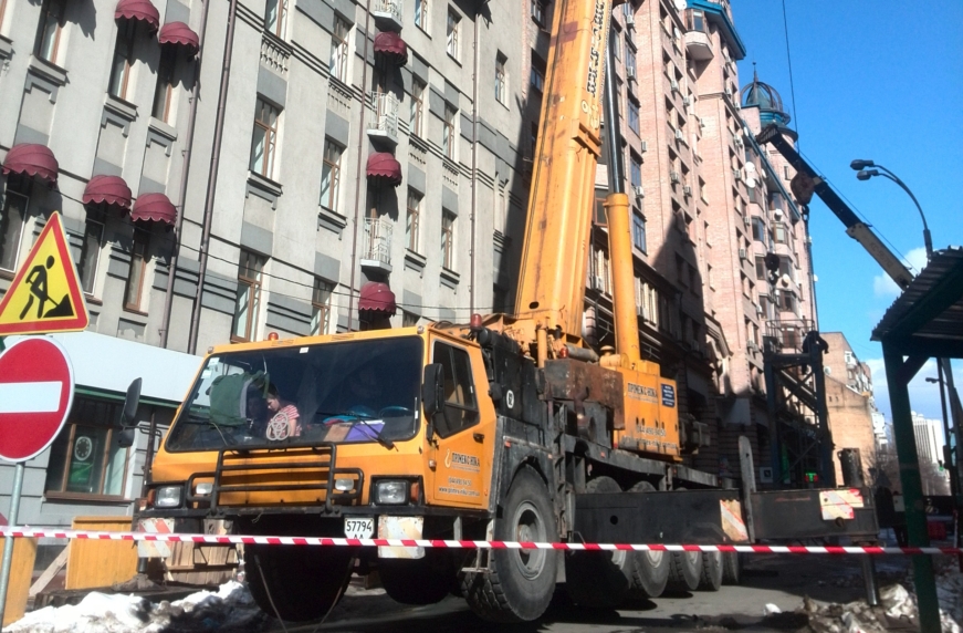 На фото автокран на строительстве дома в самом центре Киева, на улице Павловской. Шестиосное шасси, несмотря на размеры, очень маневренное. А весь секрет в том, что из шести мостов пять являются управляемыми, причем первых три поворачиваются в одну сторону, а два последних – в противоположную.