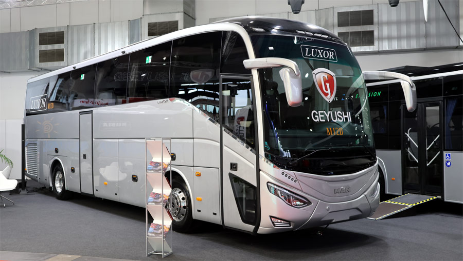 На стенді Geyushi Automotive Industry можна було побачити три автобуси різних класів. Почнемо із туристичного лайнера Luxor M12D. Модель завдовжки 12,3 м. має комфортабельний пасажирський салон на 49 місць. Тут є два стельові монітори на 19 і 22 дюйми, кухонний блок, біотуалет. Багажні відсіки мають місткість 13 кубометрів. Двигун встановлений MAN, потужністю 430 к. с. Коробка передач – механічна чи автоматична. Підвіска – пневматична.