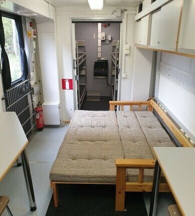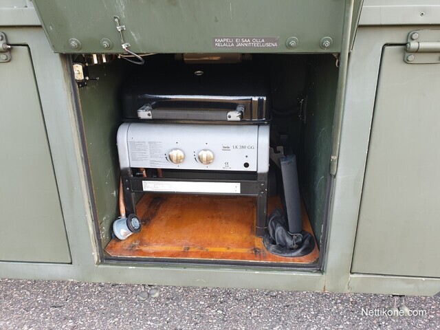 В даному випадку військовий фургон перероблений у 8-місний кемпер, з вітальнею, кухонним блоком, туалетом та спальними місцями. Тут є повітряний обігрівач, а також ще один, рідинний, який можна активувати при підключенні до мережі. Також встановлений 3-кіловатний інвертер для живлення бортових систем.