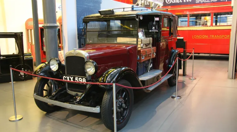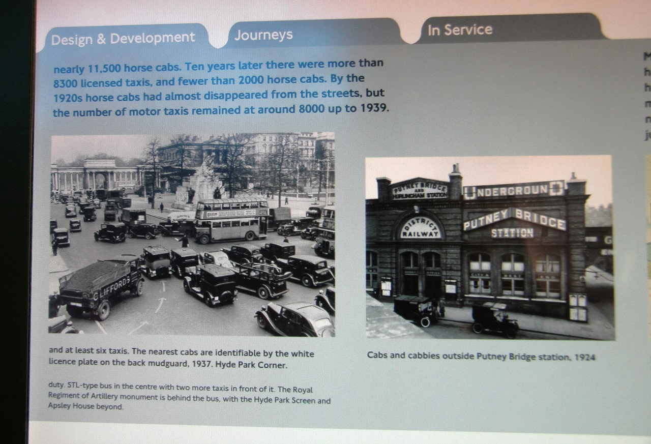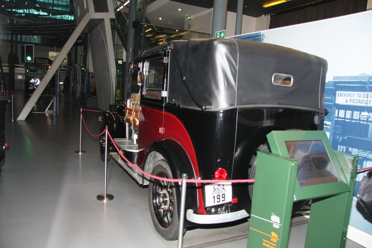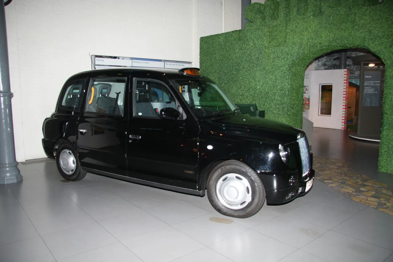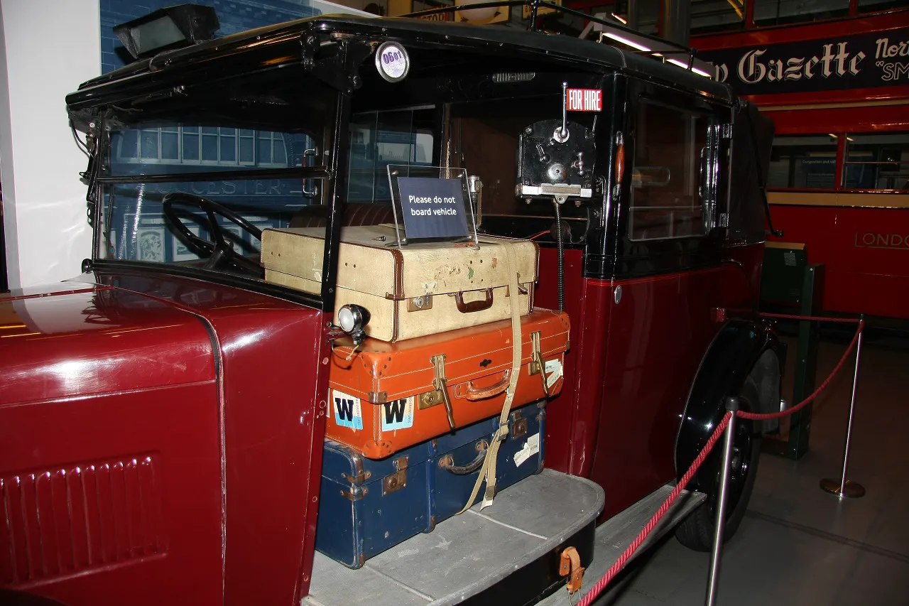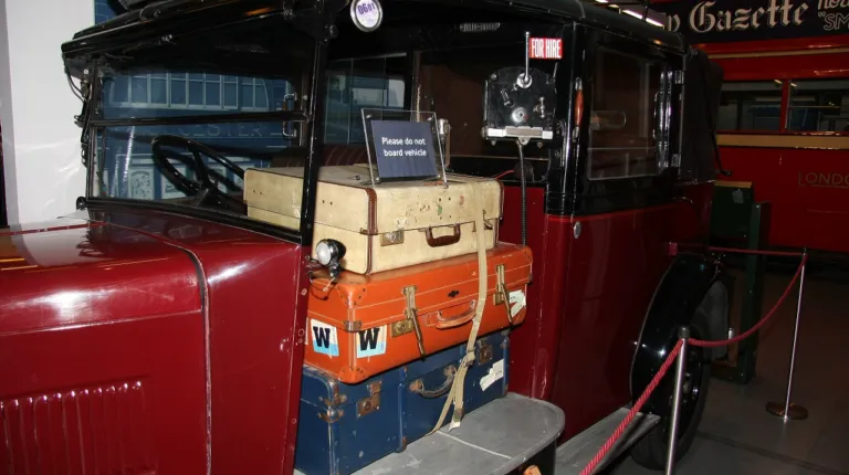 І ще про один засіб громадського транспорту – таксі. У 20-ті роки. наймані кінні кеби зникли з лондонських вулиць. Їхнє місце зайняли таксомотори, які, втім, як і раніше називали таксі. 1939 року в Лондоні працювало вже понад 8 тис. таких машин. Одна з них, випущена фірмою Austin у 1937 році, представлена у музеї. Це low loading taxi cab – дослівно «найманий таксі з низькою навантажувальною висотою». Справа в тому, що поряд з кріслом водія пасажирське крісло було відсутнє – і таким чином був зручний майданчик для розміщення поклажі.