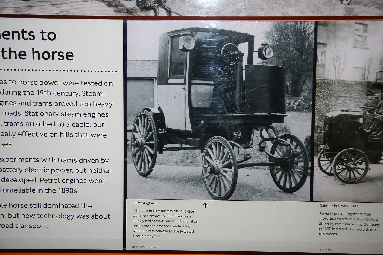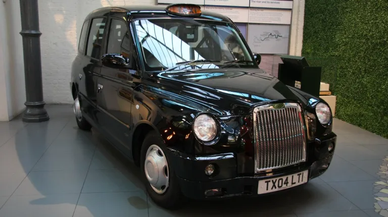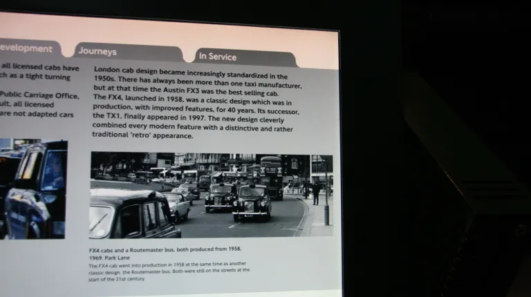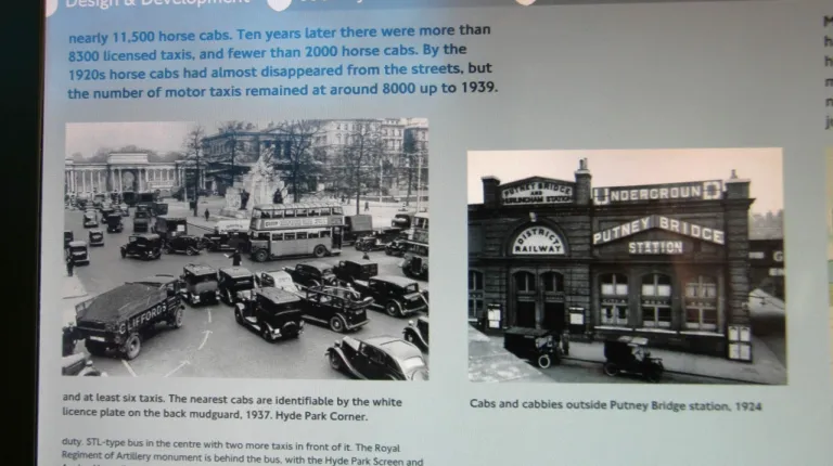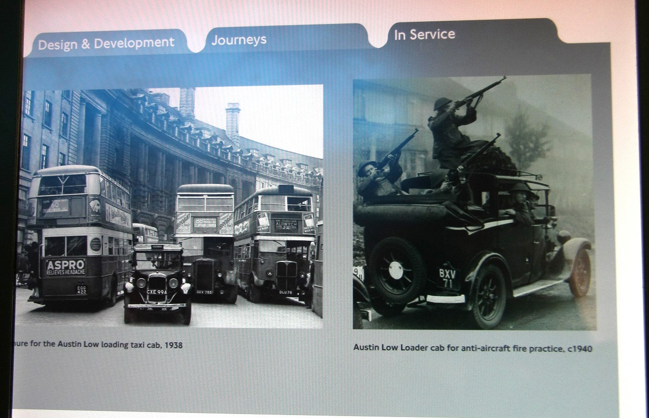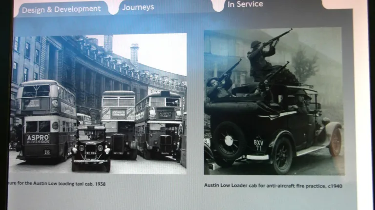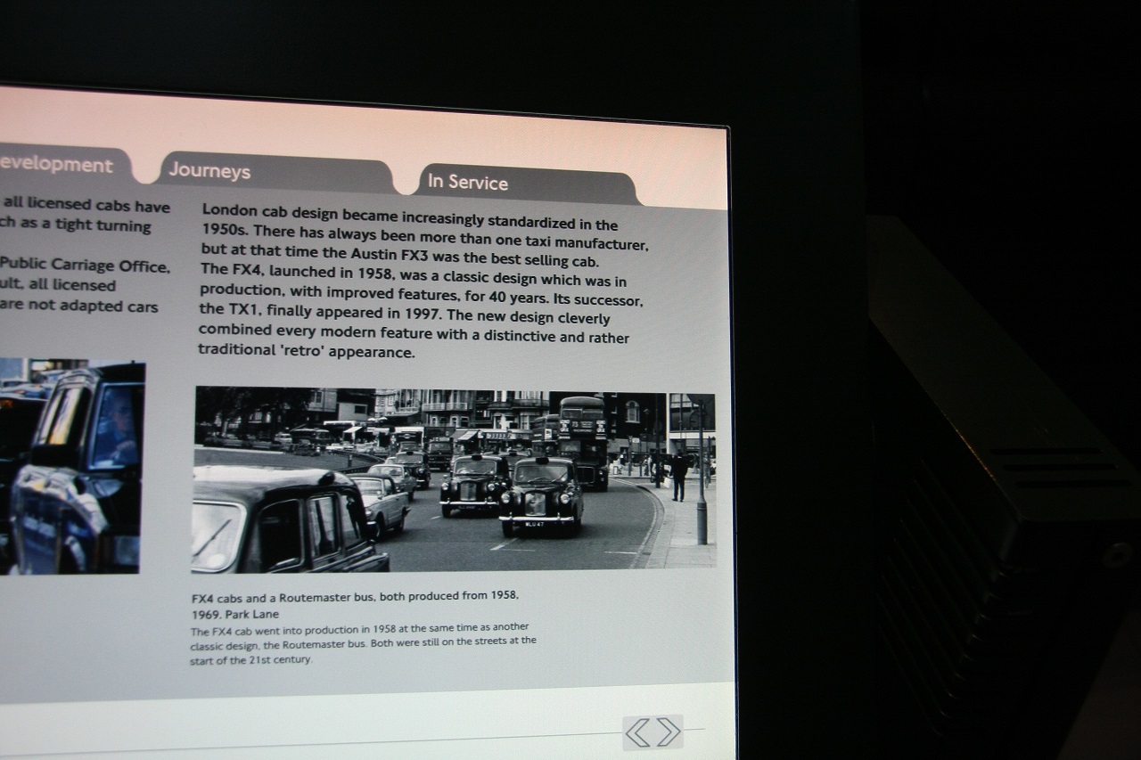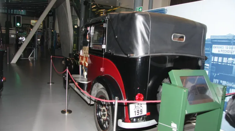 І ще про один засіб громадського транспорту – таксі. У 20-ті роки. наймані кінні кеби зникли з лондонських вулиць. Їхнє місце зайняли таксомотори, які, втім, як і раніше називали таксі. 1939 року в Лондоні працювало вже понад 8 тис. таких машин. Одна з них, випущена фірмою Austin у 1937 році, представлена у музеї. Це low loading taxi cab – дослівно «найманий таксі з низькою навантажувальною висотою». Справа в тому, що поряд з кріслом водія пасажирське крісло було відсутнє – і таким чином був зручний майданчик для розміщення поклажі.