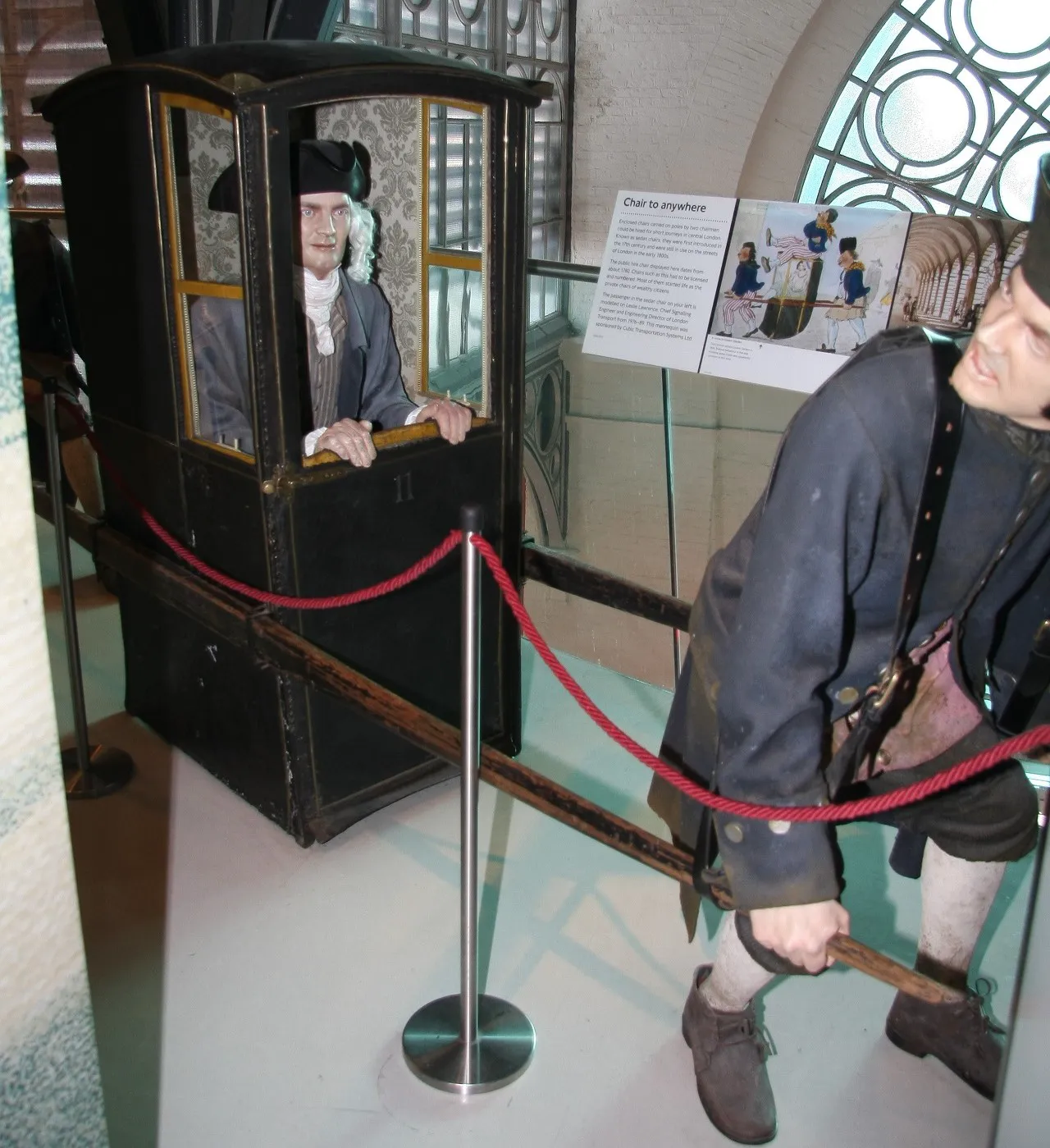Мабуть, найдавнішим та найекзотичнішим предком сучасних пасажирських транспортних засобів є криті ноші. Вони більше відомі у нас під французькою назвою портшез, але в Англії їх називають Sedan Chair. Вперше вони з’явилися в Англії у XVII столітті, але цей безколісний транспорт можна було найняти в центрі Лондона і на початку XIX століття – для пересування на невеликі відстані. Одні такі ноші, виготовлені приблизно 1780 року, можна побачити у музеї.