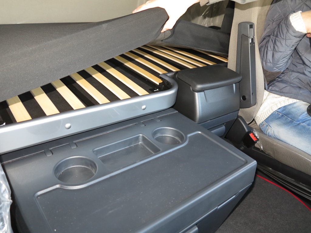 IVECO Stralis Hi-Way поставлен с самой высокой кабиной, с двумя спальными местами, объем внутреннего пространства более 10 кубометров. Благодаря продуманной аэродинамике удалось снизить коэффициент лобового сопротивления на 3%, что позитивно сказалось на расходе топлива. Внутри очень много вещевых отсеков. Большие шкафчики над лобовым стеклом, два выдвижных холодильника под нижней спальной полкой. Установлены также опционные багажные отсеки снаружи, под стандартными – за передними дверьми.