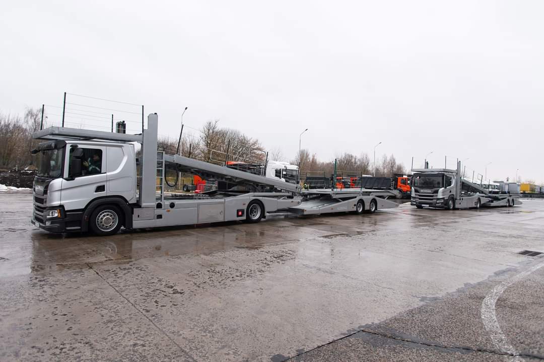 Цікаво, що два тягачі Scania P450 йдуть у парі з напівпричепами-автовозами марки Rimo. Зазначимо, що це перше постачання причіпної техніки цього литовського виробника до України.
