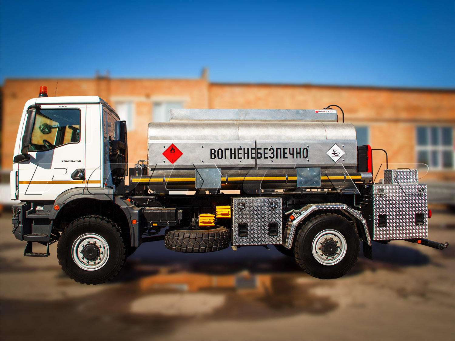 На шасі встановили двосекційну цистерну типу “валіза”, місткістю 8000 л. Вона виготовлена з нержавіючої сталі та обладнана хвилегасниками, які забезпечують стійкість машини на ходу та служать додатковими елементами жорсткості. АПЗ оснащений насосом продуктивністю 500 л/хв, а також фільтрами грубого та тонкого очищення пального. У комплект також входять розподільний шланг на 10 м та роздавальний пістолет з пропускною здатністю 120 л/хв.