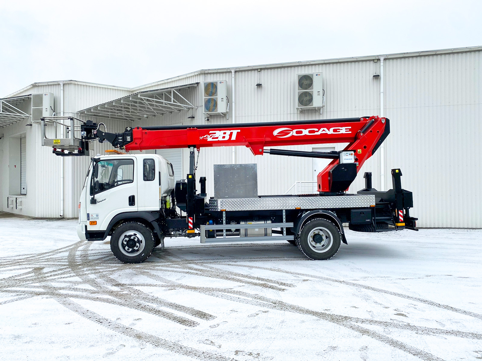 На середньотоннажному шасі Dayun CGC1120, до речі теж місцевої збірки, встановили автогідропідйомник відомої італійської марки Socage. Модель 28Т має робочу висоту підйому 28,5 м та горизонтальний виліт 17,3 м. Вантажопідйомність люльки становить 400 кг. Остання повертається на кут 90+90 град., що розширює робочу зону, плюс має ізоляцію до 1000В.