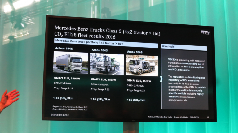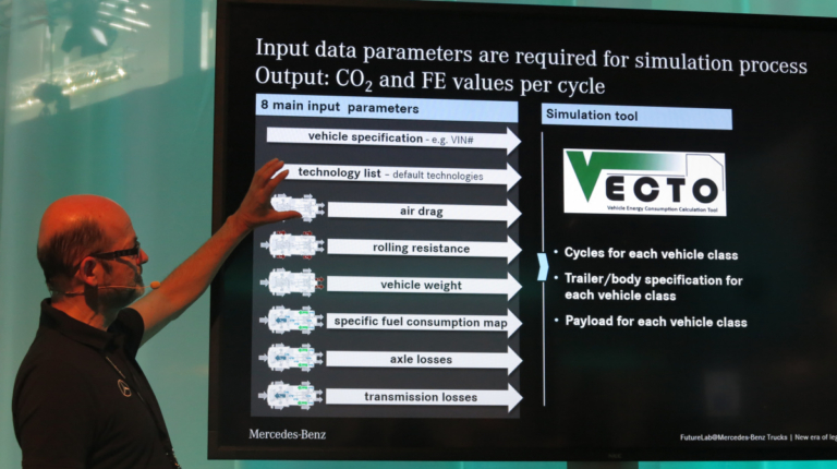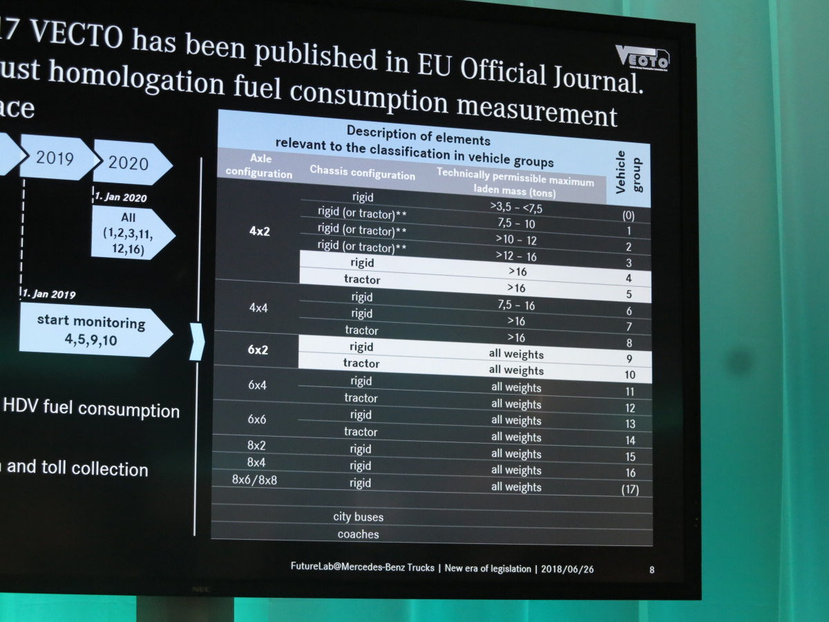 В первую очередь под лирективу попадают тягачи и шасси 4х2 полной массой свыше 16 т и тягачи и шасси 6х2 любой массы – т. е. 60% всех грузовиков тяжелого класса в Европе. А с 1 января 2020 года к ним добавятся и все остальные грузовики полной массой от 7,5 т и выше, с различными колесными формулами. Уже разработано и специальное программное обеспечение для определения реального расхода топлива и выбросов СО2 – под название VECTO, что расшифровывается как Vehicle Energy Consumption Calculation Tool.