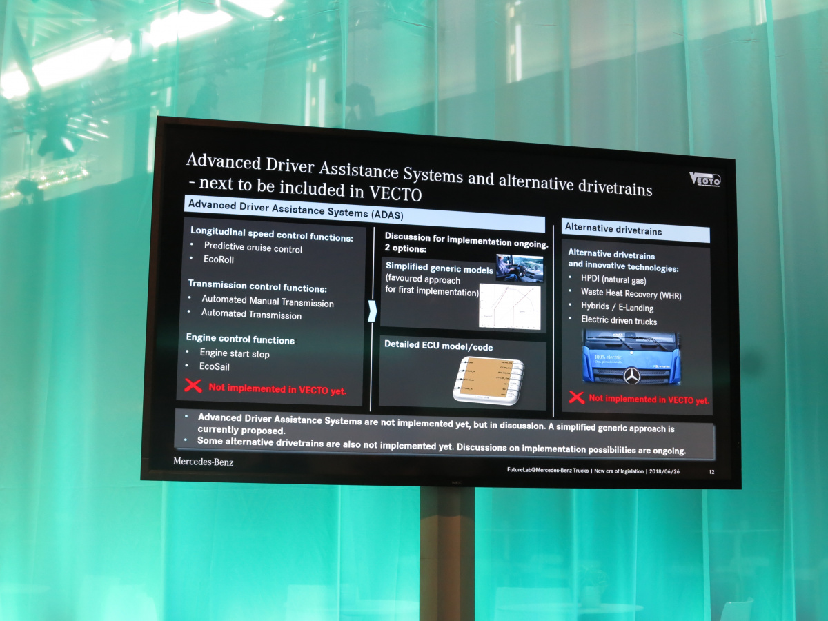 VECTO пока не будет учитывать такие электронные системы, помогающие экономить топливо как Engine start-stop, Predictive Cruise Control, Eco Roll; в этот список также попали автоматизированные механические или полностью автоматические коробки передач.