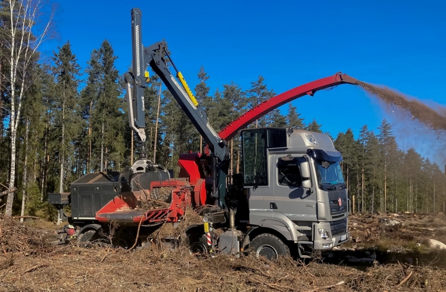 На чотиривісне шасі колісної формули 8х8 було встановлено спеціальне обладнання від шведського виробника OP Ergo AB – з дробильним барабаном та двигуном потужністю 701 к. с. Їй під силу подрібнювати пні, стволи та гілки. Для подачі деревини до барабана служить кран-маніпулятор Сranab із захватом.