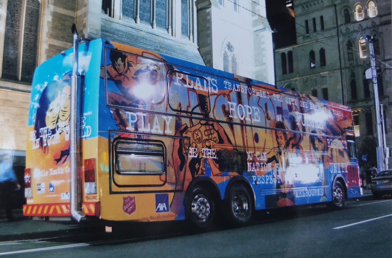 А цей туристичний Volgren з нижнім поверхом у кормі був перероблений на молодіжний центр розваг. Шасі – Scania. Увагу привертая височена вихлопна труба на кормі.