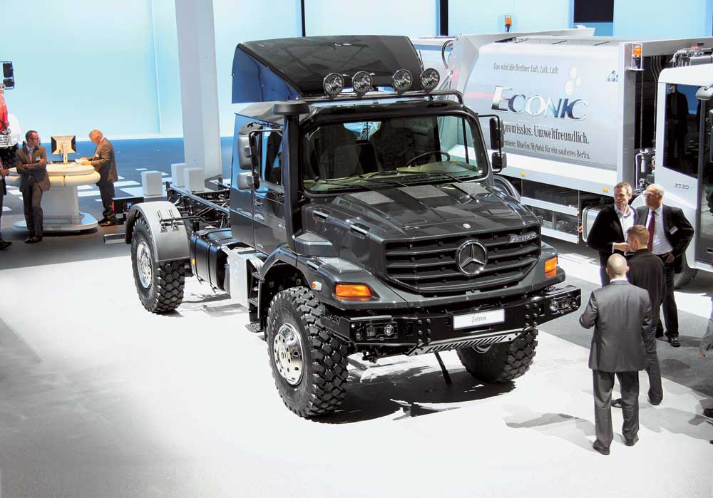 Сенсация салона – премьера новой модели в линейке Mercedes-Benz, полноприводного грузовика Zetros. Он имеет капотную компоновку по типу легендарных вездеходов Unimog, но стоит на ступеньку выше. У Zetros – постоянный полный привод (4х4 или 6х6), двухступенчатая «раздатка», блокируемые межосевой и межколесные дифференциалы.