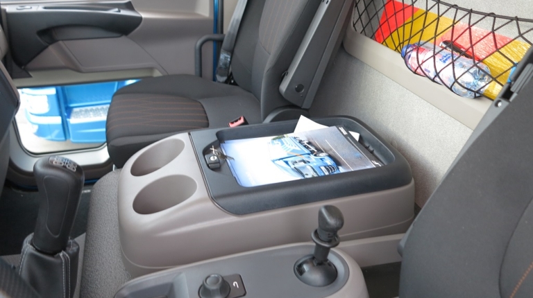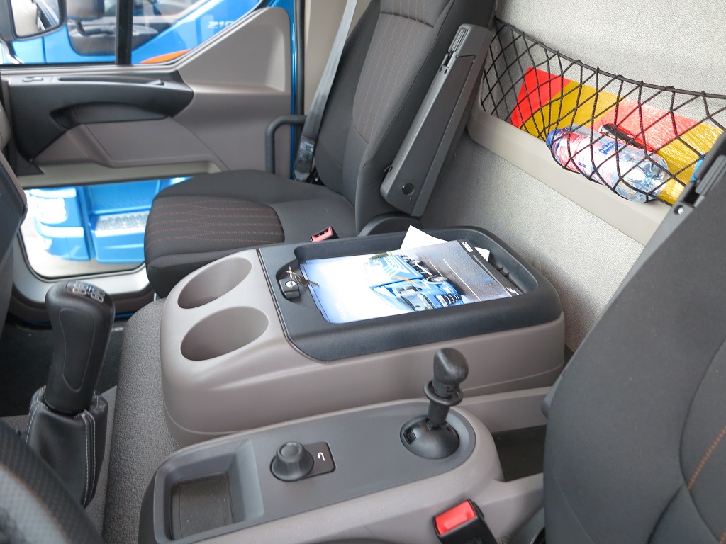 Топливный бак почти в 6 раз больше – не 110, а 600 литров. И это еще не предел. LF можно заказать с колесной базой до 6,9 м и установить топливный бак на 1240 литров. Настоящий дальнобойный трак, отлично подходящий для перевозки крупнообъемных грузов. Кстати, в кабине есть откидная спальная полка, которую можно установить, сложив предварительно спинки передних сидений.