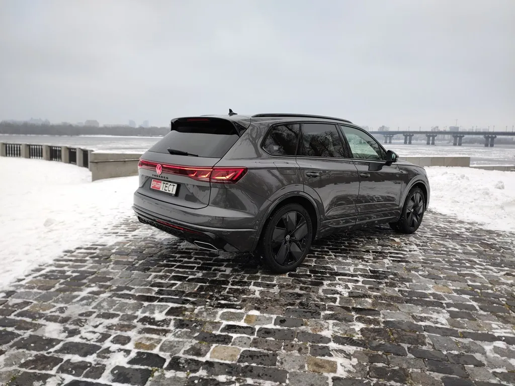 Світло у зовнішності оновленої моделі грає одну з головних ролей. Адже серед ключових змін після рестайлінгу - оновлений передній бампер, більша решітка радіатора, оновлена оптика та деякі нові для Touareg світлові елементи. Це тоненькі смужки, що світяться, і простяглися вони від фари до фари як спереду, так і позаду. І саме за ними можна легко відрізнити рестайлінгову версію. Доволі модний елемент зараз і зустрічається часто, зокрема на інших моделях бренду, тож тепер ним може похизуватися і флагманський кросовер. Також в палітру кольорів додали червоний відтінок, який раніше не пропонувався, втім тестовий автомобіль був стриманого сірого кольору.