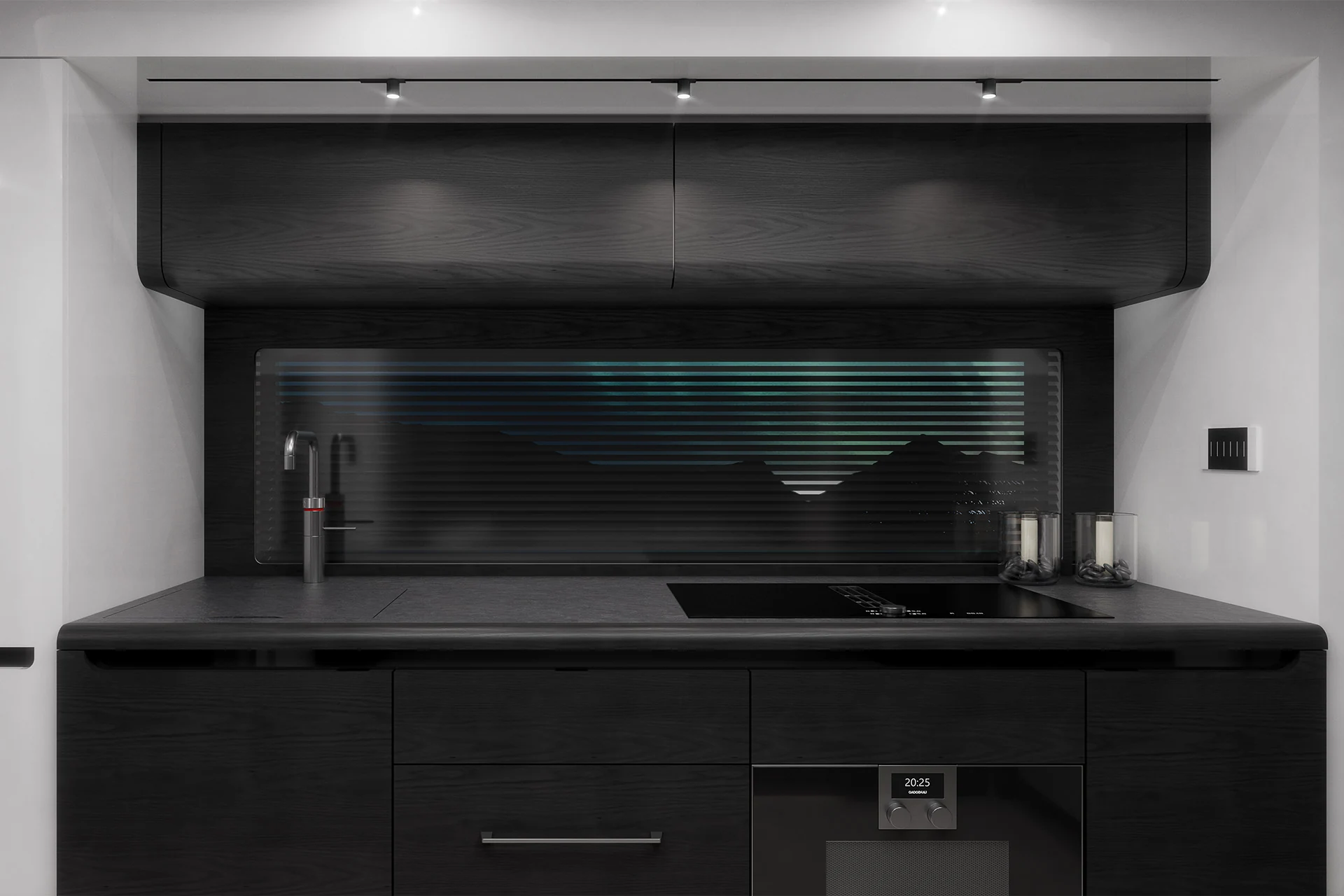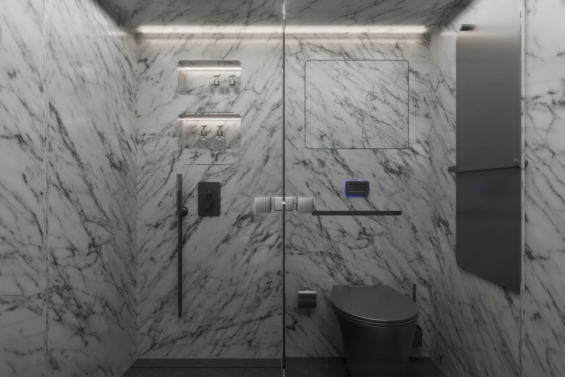 Кухня від Brabus також на висоті. В оснащення входять індукційна плита, духовка, посудомийна машина та великий холодильник із вбудованою морозильною камерою. Є також винний холодильник та кавоварка. Між спальнею та вітальнею розташована ванна компанія, оброблена натуральним каменем. Тут є тропічний душ, туалет та раковина.