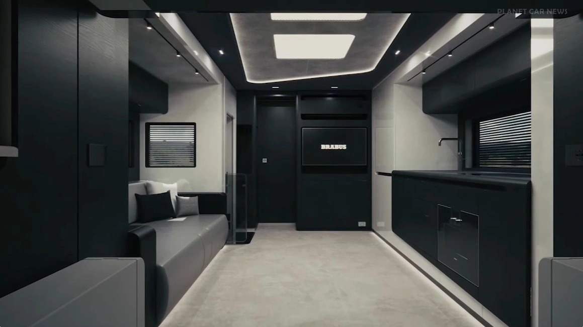 Інтер'єр не залишить байдужим. Почнемо зі спальні. Тут встановлене двоспальне ліжко розміром 160 х 200 см, письмовий стіл і 43-дюймовий 4K-телевізор з вбудованим PlayStation 5. Такий же ТV є й у вітальні, де знаходяться два дивани, оббиті тонкою шкірою з прострочкою Brabus «Triangle». В інтер'єрі натуральна сіра шкіра гармонійно поєднується з темним деревом цінних порід та кевларовими вставками.
