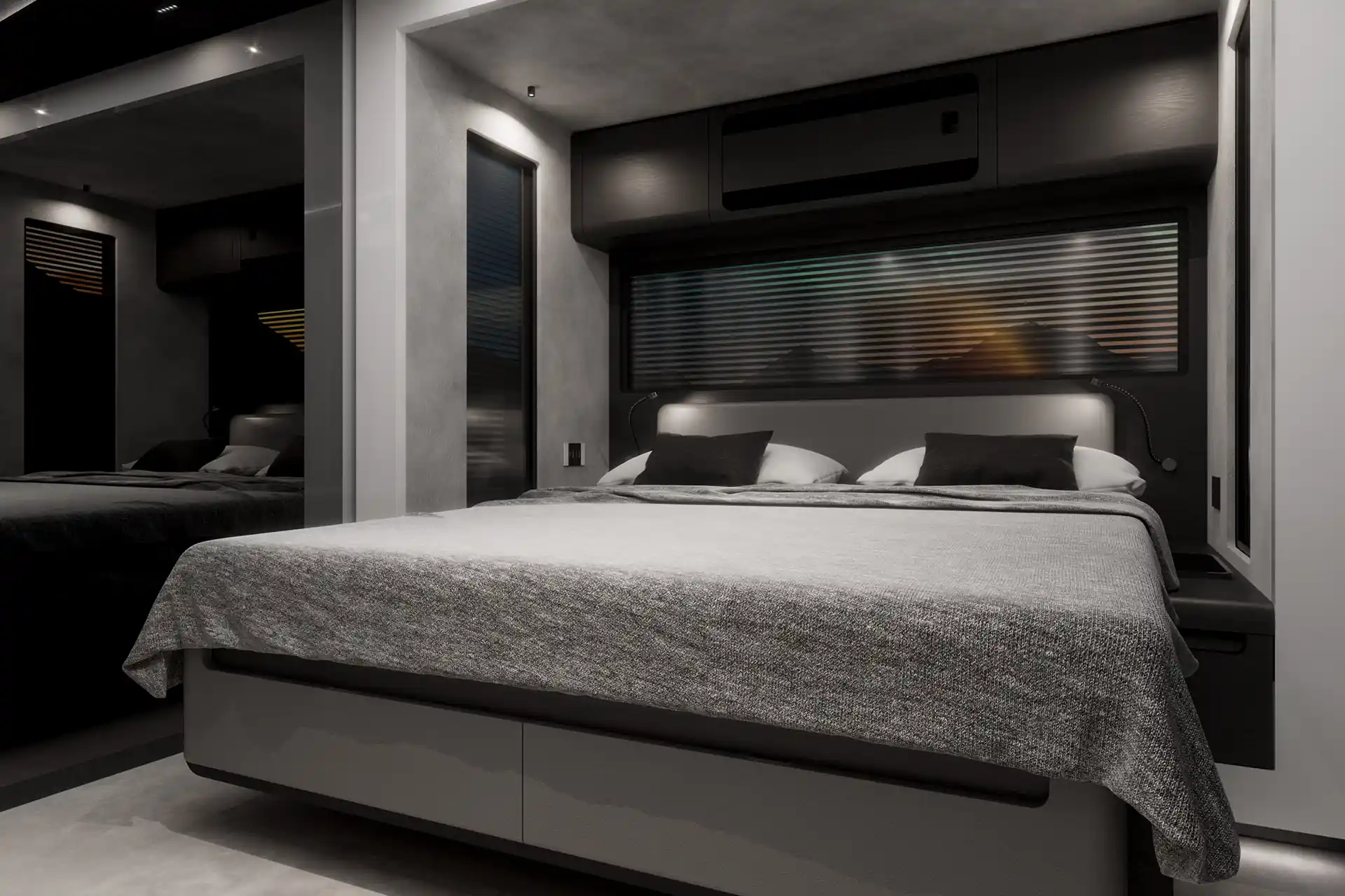 На стоянці ширину салону можна збільшити до 4,5 м чотирма висувними секціями – по дві з кожного борту. У розкладеному стані стійкість чималенького автобудинку забезпечують чотири гідравлічні аутригери з функцією автоматичного вирівнювання.