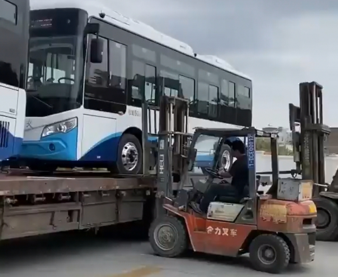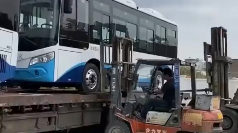 Фуру з китайськими електробусами розвантажили незвичайним способом (відео)