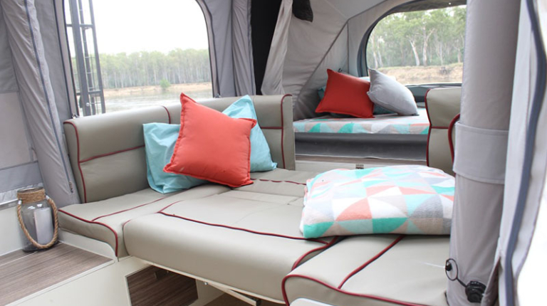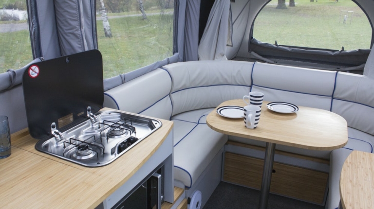Здесь с комфортом могут расположиться до 6 человек. Есть две широкие кровати, кухонный блок (с газовой плитой, рукомойником и холодильником) и небольшой туалет. Все мягкая мебель и шкафчики сделаны складными.