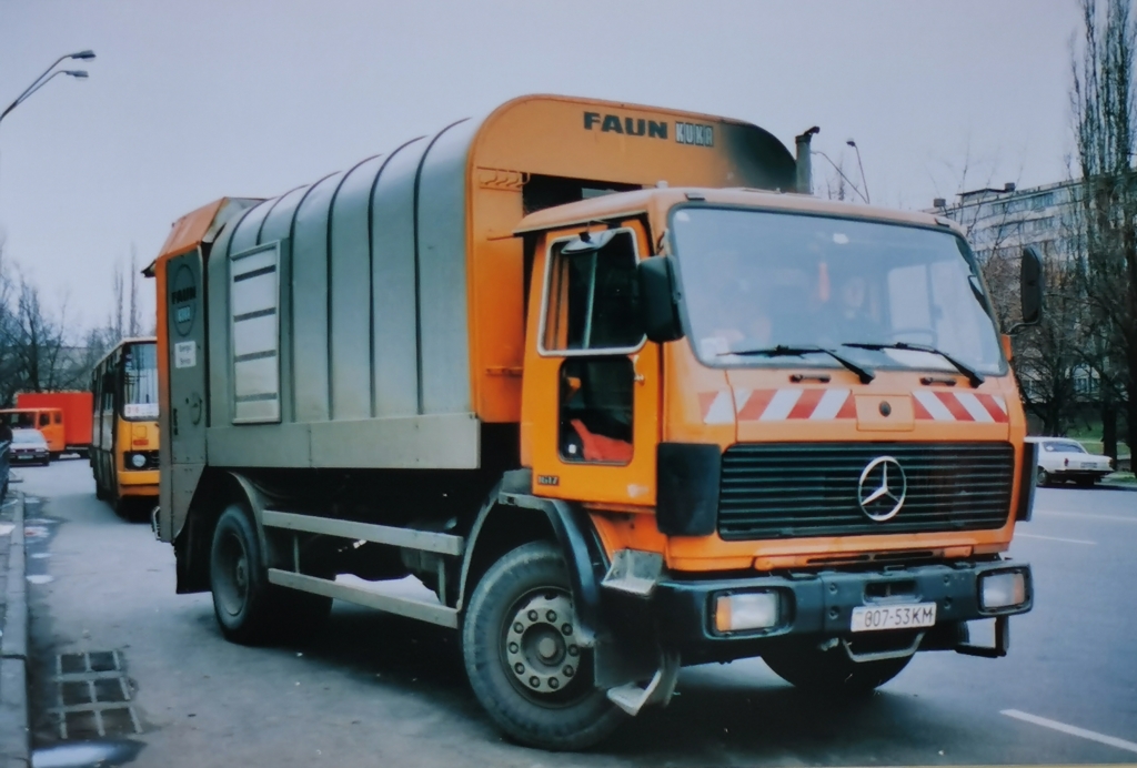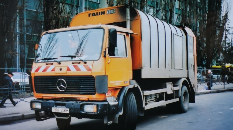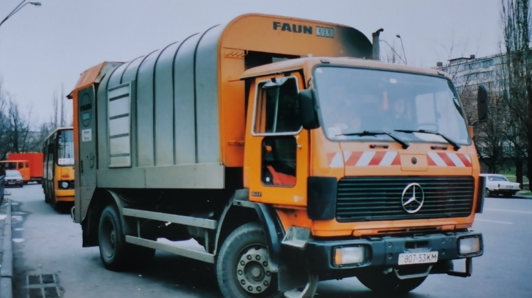 Приблизно такі самі були і у Mercedes-Benz — одну з моделей 1617 (4х2), з надбудовою Faun Kuka, нам пощастило сфотографувати в столиці ще в 2002 році. А тепер ось попався й MAN — також із кузовом марки Faun.