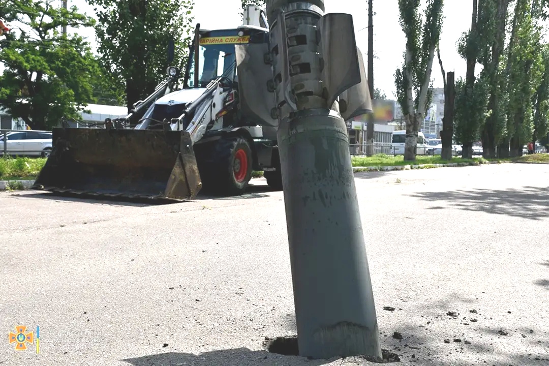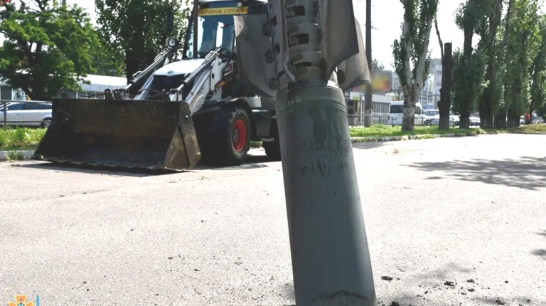У минулі вихідні застряглі в асфальті снаряди від РСЗВ «Смерч» приїхали витягувати екскаватор-навантажувач Caterpillar B730 і повноприводний Mercedes-Benz Unimog. У цьому випадку залишки боєприпасів не становили загрози.