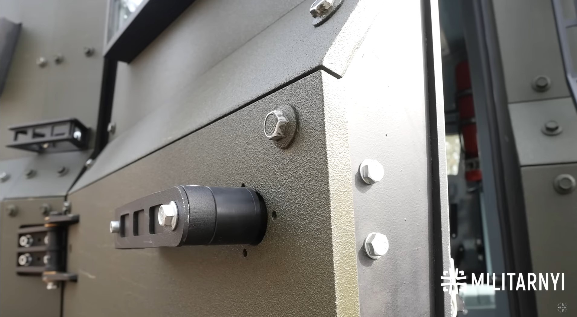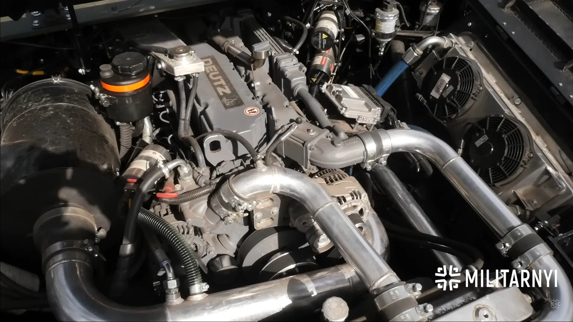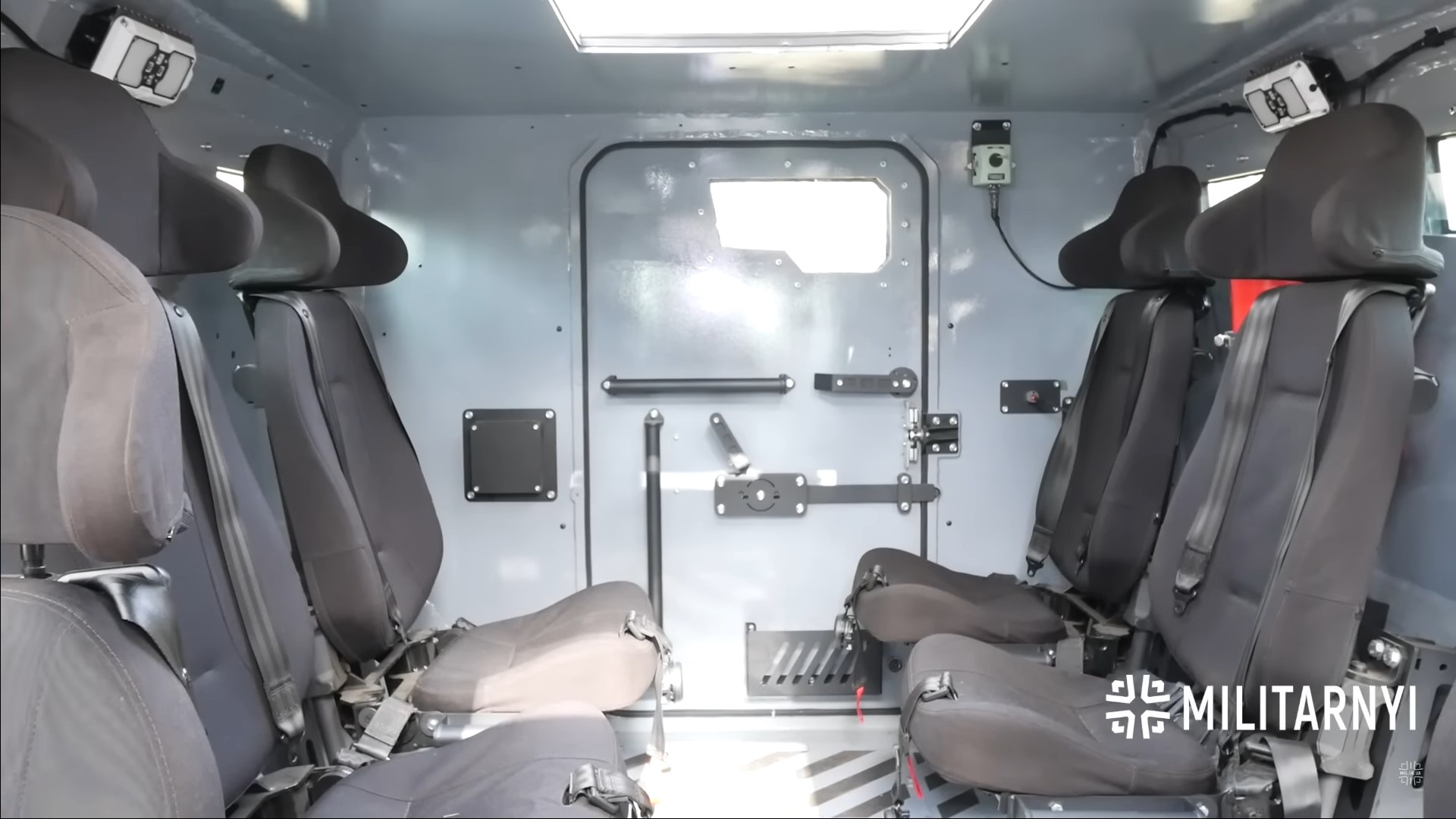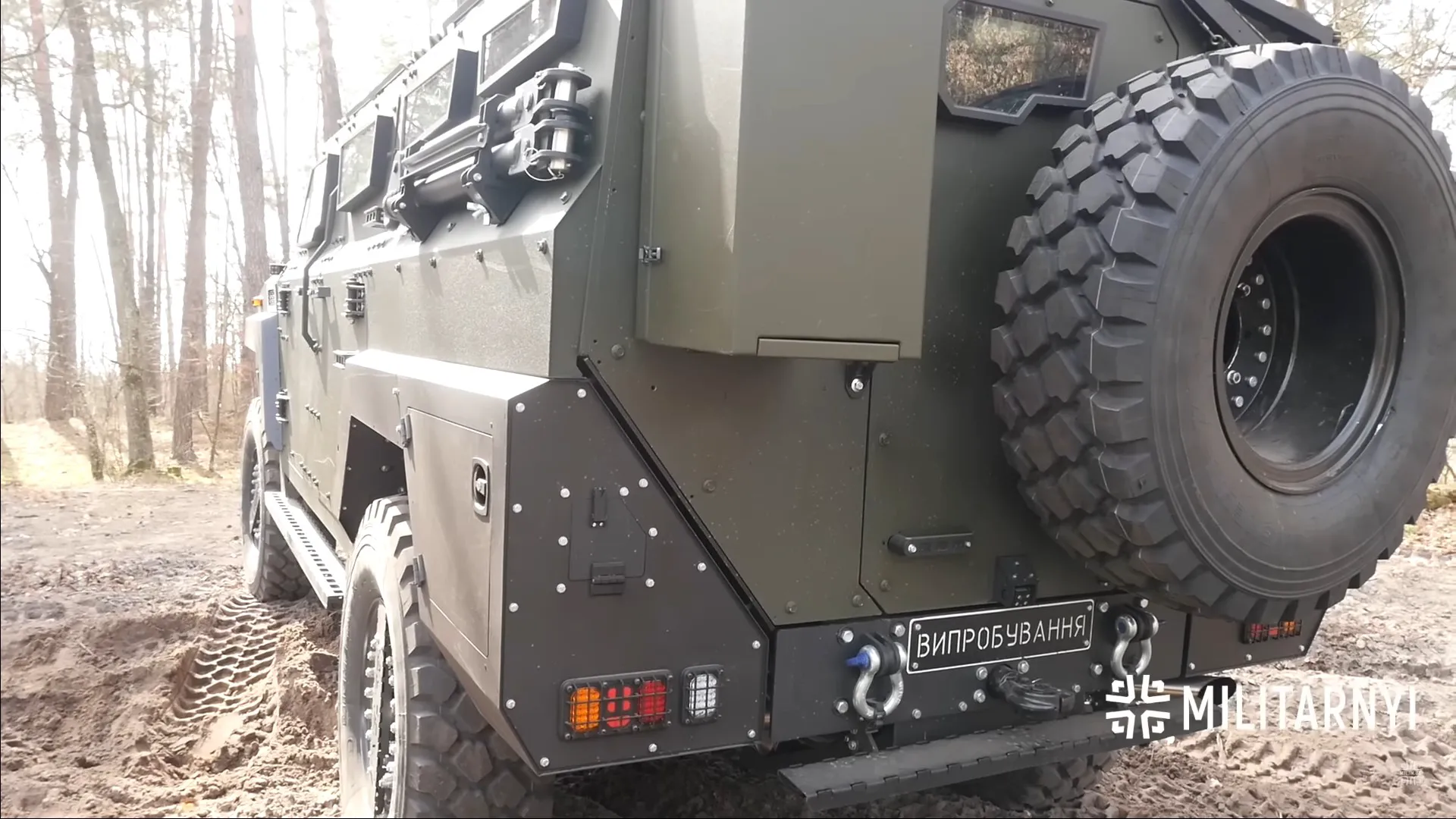 Що ж до корпусу, то тут застосовується комбіноване бронювання – зовнішні панелі з алюмінію завтовшки 16 мм, швейцарського виробництва AMG5, а за ними шведська сталь Armos 500 Т завтовшки 8 мм. Броньовані панелі, так само як і кулестійке скло можна легко замінити, відкрутивши відповідні болти. У представленому виконанні машина має споряджену масу 12 т і повну 15 т. Передбачено навіть тривісний варіант (6х6) зі збільшеним на 7 т навантаженням.