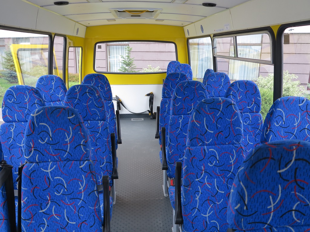 Всего в салоне 21 место: 19 для школьников и еще два – для сопровождающего и члена экипажа. Подсиденьями установлены металлические лотки для школьных ранцев. Все сиденья оснащены двухточечными ремнями безопасности. Крайние от прохода кресла укомплектованы откидными подлокотниками. На стенках есть тревожные кнопки для подачи сигнала водителю в экстренных случаях.