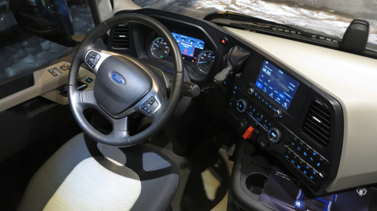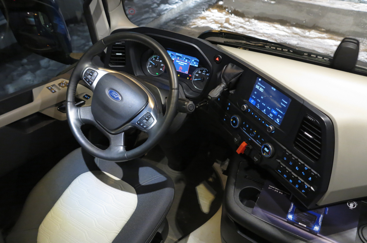 И здесь Ford Trucks F-MAX также не узнать. Полностью новая, развернутая к водителю приборная панель – с 8-дюймовым монитором щитка приборов и 7,2-дюймовым дисплеем тачскрин мультимедийной системы. Новый, многофункциональный руль.