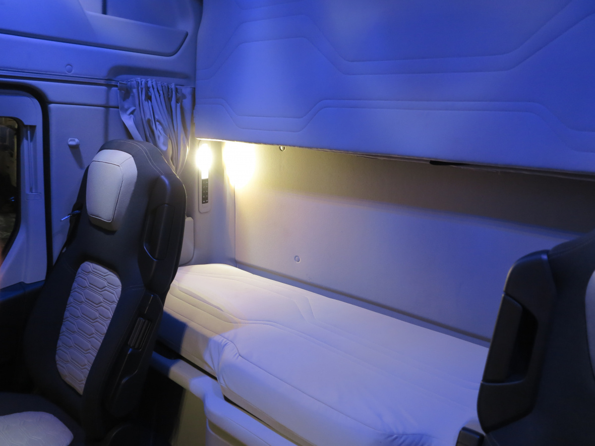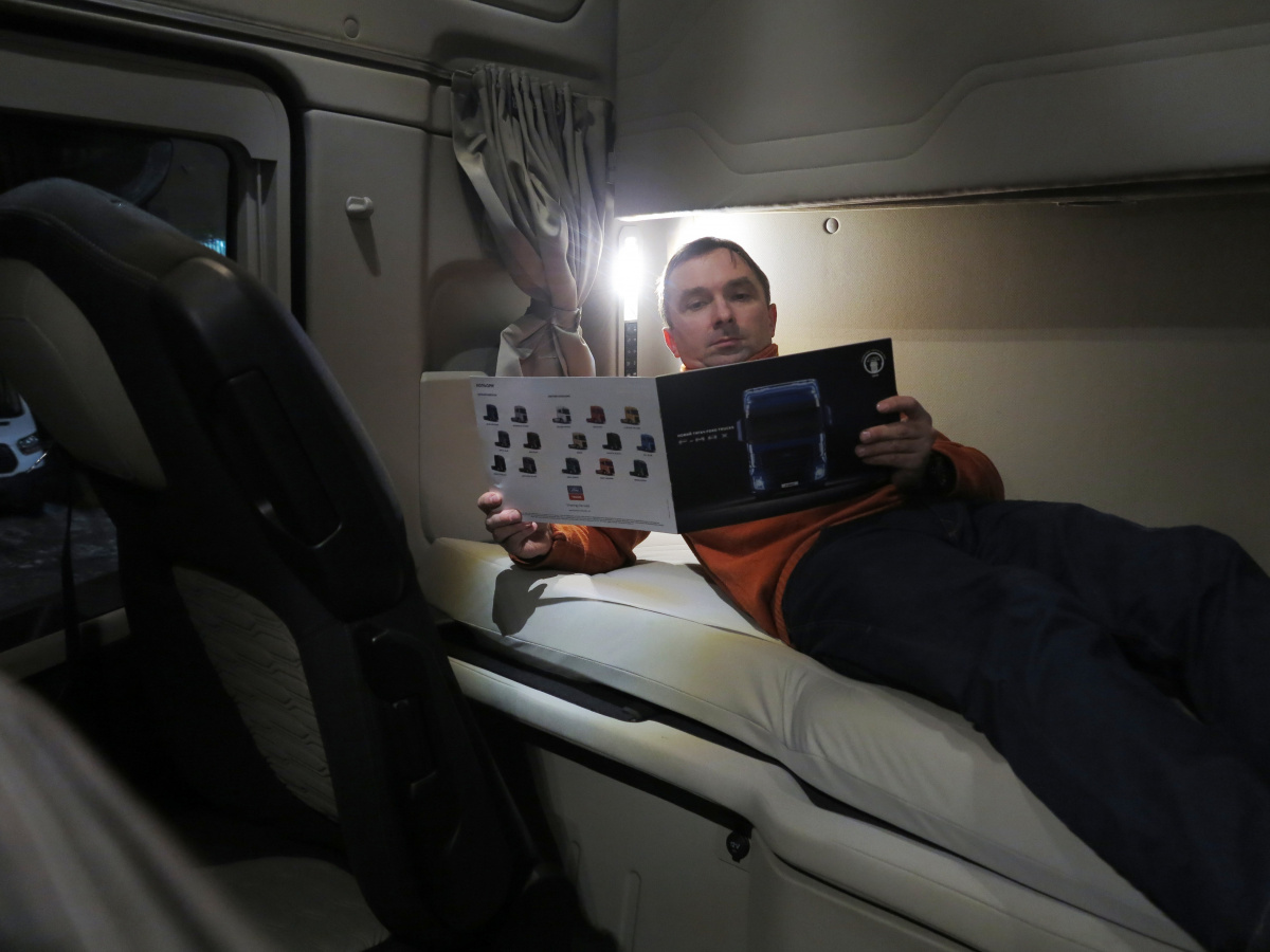 Понравилось и кресло водителя с интегрированным подголовником. Оно регулируется в продольном направлении в рекордно большом диапазоне – 260 мм. Здесь также регулировки по высоте и углу наклона подушки, а также регулировки поясничного подпора. Кресло водителя и напарника – на пневмоподвеске, каждое – с двумя откидными подлокотниками.