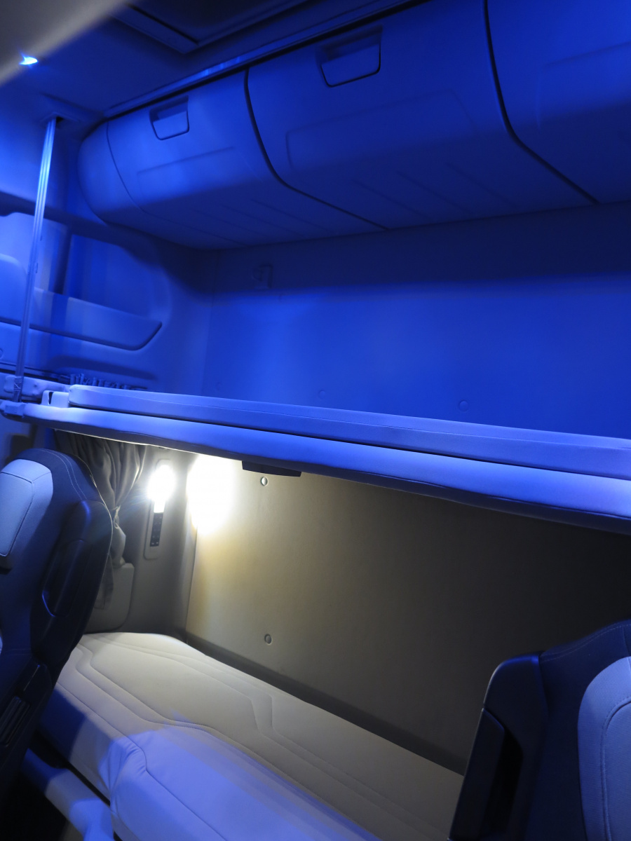 Особое внимание заслуживает внутреннее освещение. Оно довольно мощное и имеет два режима – обычный и ночной (с голубой подсветкой). Кроме того, индивидуальный пульт управление светом, равно как и электроприводом люка в крыше есть и в спальном отсеке, на боковой стенке с правой стороны.