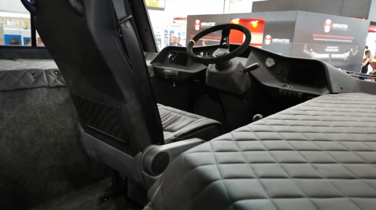 Почнемо з того, що Atlas вміщує до 12 осіб, включаючи водія. Всі колеса зроблені не тільки ведучими, але й поворотними – з трьома режимами управління, що дозволяє досягти радіусу розвороту всього 6 м. У рух машину спорядженою масою 2200 кг приводить 90-сильний дизельний двигун K9K, запозичений у кросовера Renault Duster.