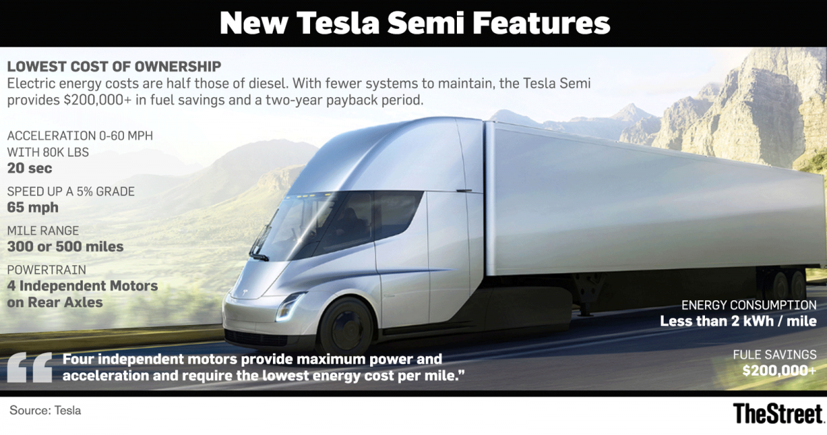 Тягач с колесной формулой 6х4 оснащен четырьмя электромоторами по 258 л.с. каждый, которые приводят в движение колеса спаренных осей. В зависимости от емкости батарей, автопоезд имеет запас хода 500 или 800 км. Расход электроэнергии составляет менее 2 кВт.ч на одну милю (1,6 км). Ранее сообщалось, что серийное производство Tesla Semi начнется в 2019 году. Ориентировочная цена за тягач с обычной батареей – 150 тыс. долларов, а с более емкой – 180 тыс. долларов.