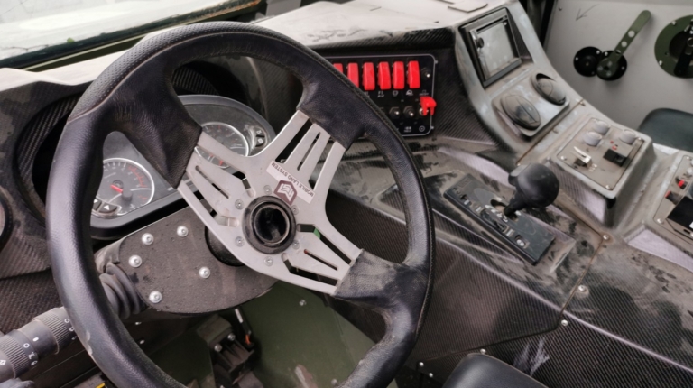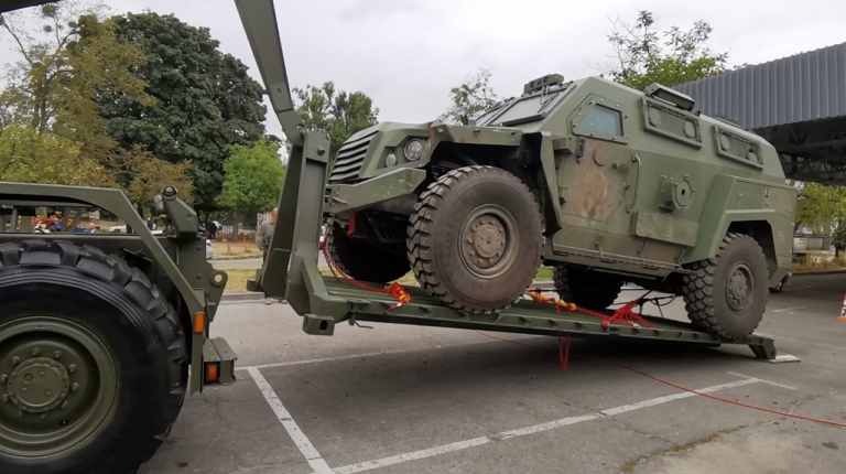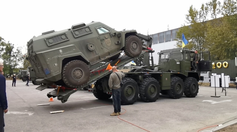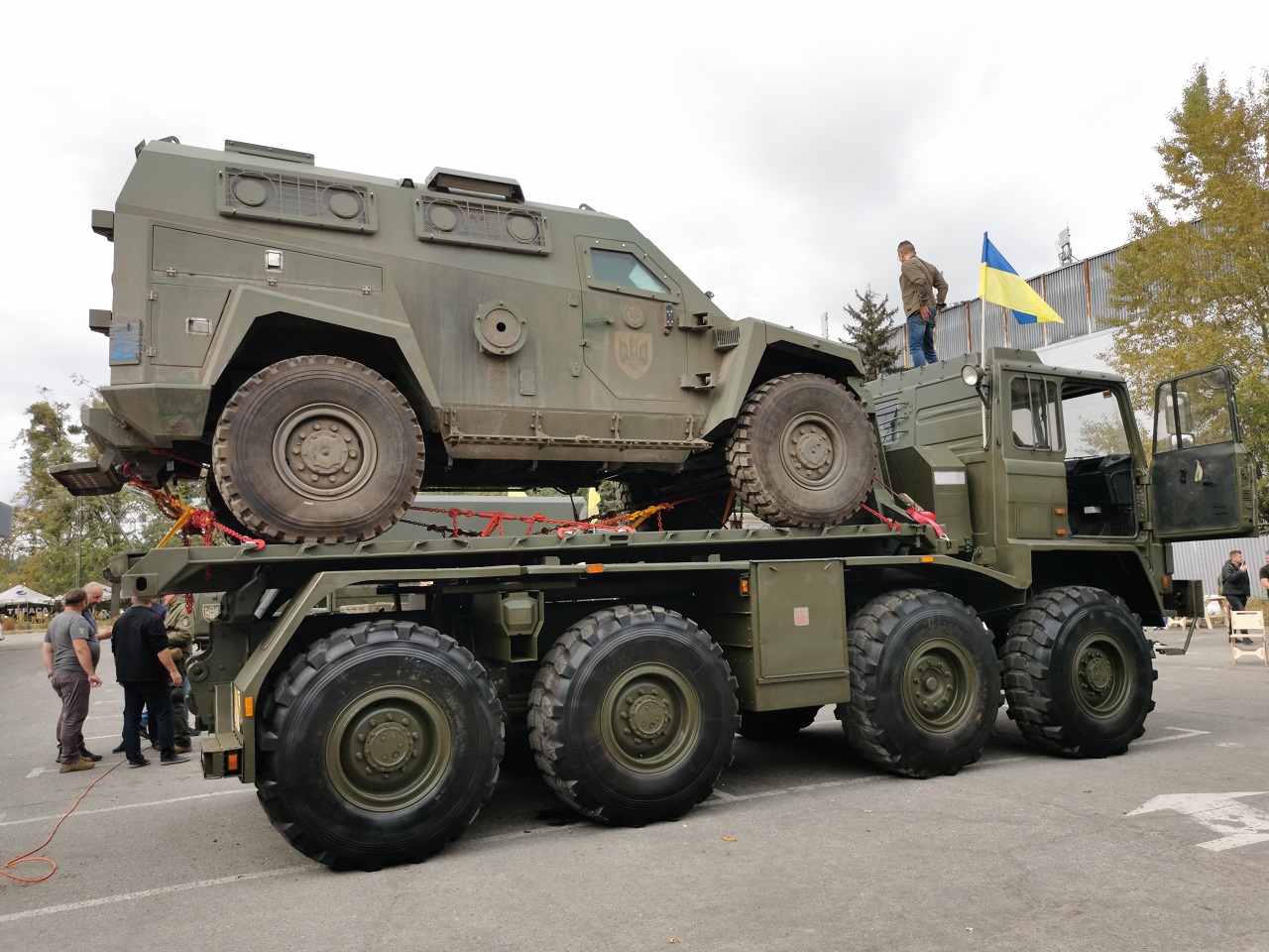 Цікаво, що роботу цього гіганта можна було побачити на власні очі. В даному випадку завантажували та розвантажували бронемашину MLS Shield. На сьогоднішній день для ЗСУ передано всі 11 од. із запланованих. Вартість проекту – 90 млн. грн.. Половину від цієї суми зібрали за донати небайдужих громадян. Це італійські багатоцільові бронеавтомобілі, які на практиці показали відмінну захищеність. На полі-бою вони витримують приліт пакету «Граду», а також пряме влучання ракети від ПТРК Корнет.