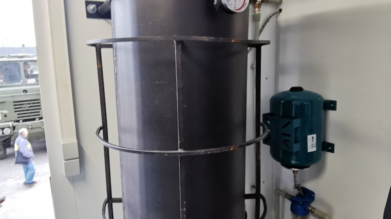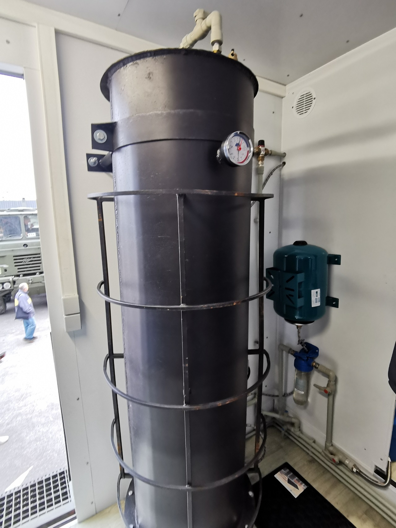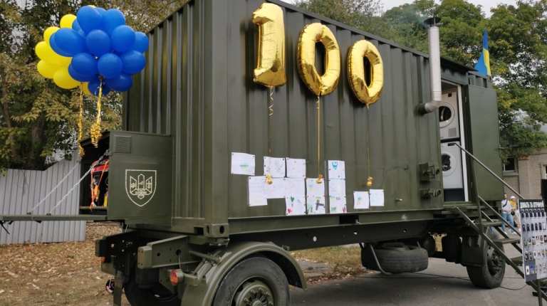 Також на ВДНГ демонструвалася ювілейна, 100-та мобільна лазня, підготовлена для ЗСУ. Таких передано вже 89 од., а на 2023 всього заплановано поставити 150 од. Вартість однієї – 520 тис. грн. Банно-пральні комплекси дуже потрібні на передовій – вони необхідні кожному батальйону. Комплекс повністю автономний. Він нагріває воду за 15 хв. Тут встановлено генератор на 7,5 кВт. для двох пральних та двох сушильних машин, а також для насосної станції. Запас води дозволяє помитися та попратися сотням бійців. Устаткування розміщено у 20-футовому контейнері, встановленому на двовісному причепі, на осях BPW з пневмопідвіскою.
