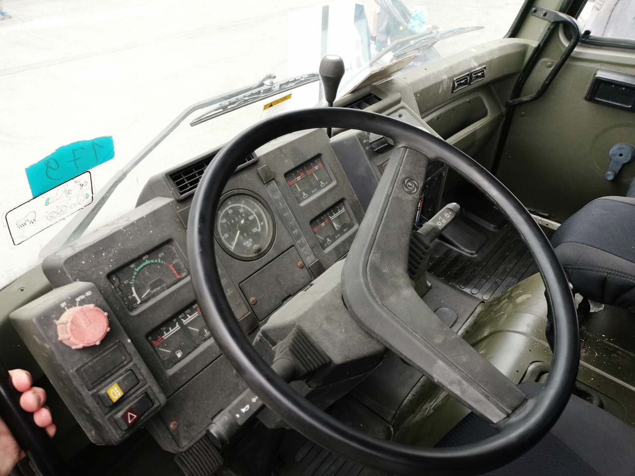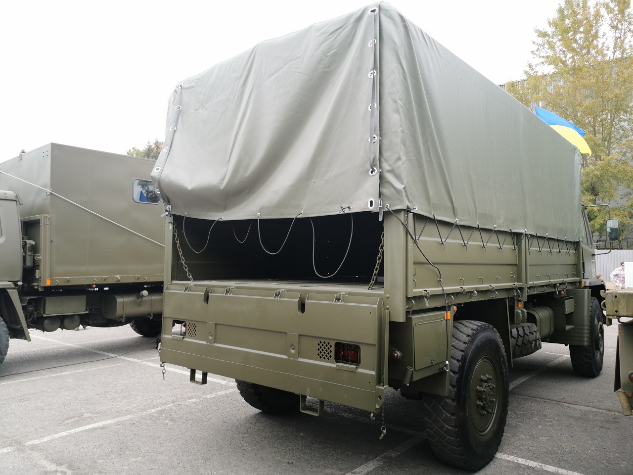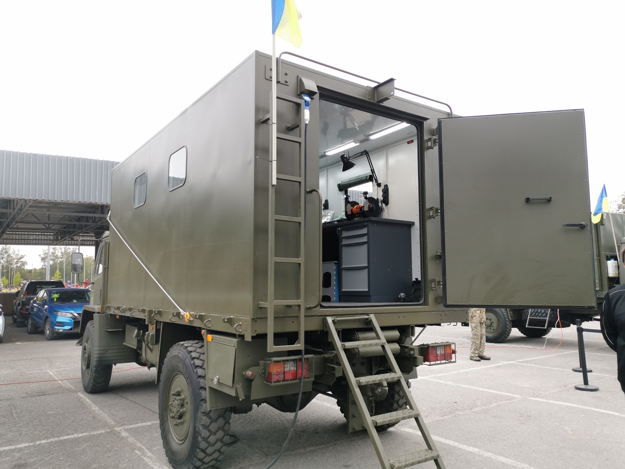 Демонструвався і ще один спеціальний DAF-Leyland 45.150 (4х4) – як мобільна станція техобслуговування та ремонту. Наші захисники вже отримали 26 таких машин, а всього цього року заплановано поставити 50 од. Вартість одного автомобіля – 924 тис. грн. Кузов укомплектовано необхідним інструментом, верстатами, домкратами та зварювальним апаратом. Живлення забезпечує генератор на 7,5 кВт. На передньому бампері можна побачити кранову стрілу.