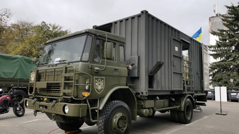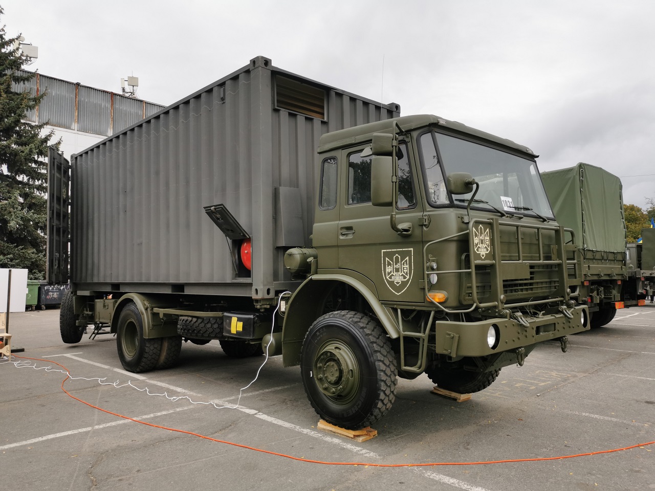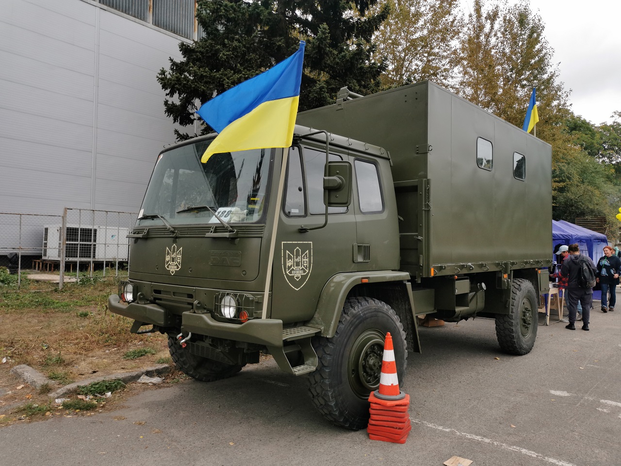 Поруч на базі DAF YA 4442 (4х4) був представлений і автомобіль як мобільний шиномонтаж. Два такі вже працюють у наших захисників, а до кінця року поставлять ще вісім од. Ціна машини – 904 642 грн. Устаткування розміщується у 20-футовому контейнері, який оснащений краном-стрілою, здатним піднімати до тонни вантажу. Майстерня може відремонтувати колесо від будь-якої техніки, яка сьогодні використовується у ЗСУ.