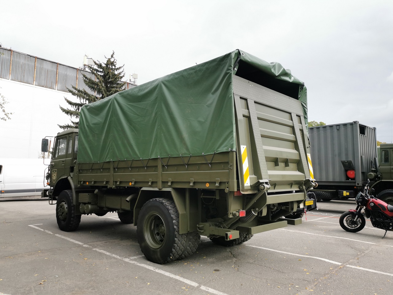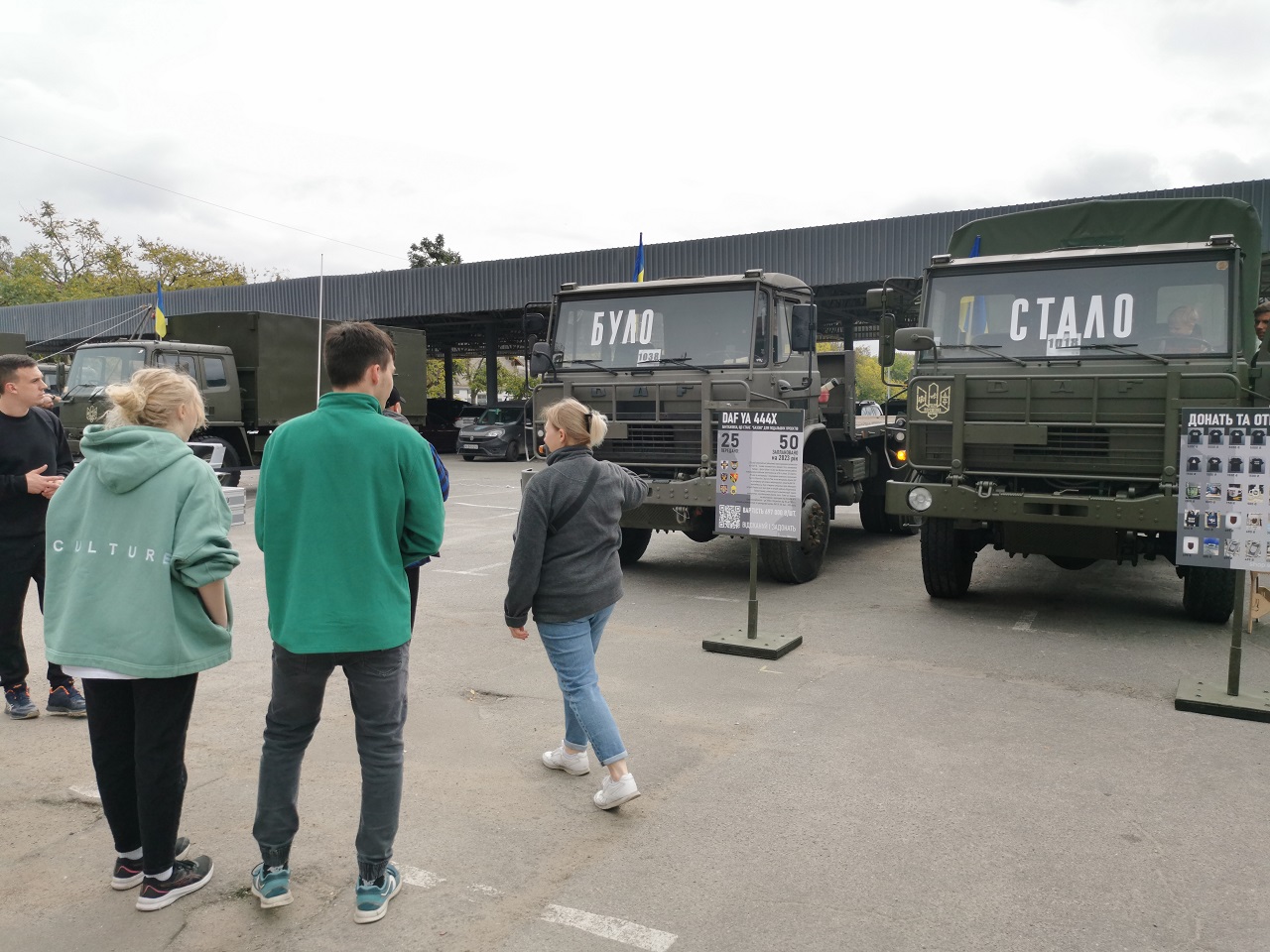 На ВДНГ також представили і більш потужні автомобілі – DAF YA 4442 (4х4). Із запланованих 50 машин на цей рік на передову вже відправлено 25 од. Вартість однієї – 697 тис. грн. Вантажопідйомність автомобіля складає 4 т, а повная маса – 12 т. Шестициліндровий двигун DAF DT 615, залежно від комплектації, розвиває 154 або 180 к. с. Бак вміщує 200 л. Показана бортова машина оснащена гідробортом Dhollandia. Таким чином, це чудова підмога нашим артилеристам для підвезення снарядів.