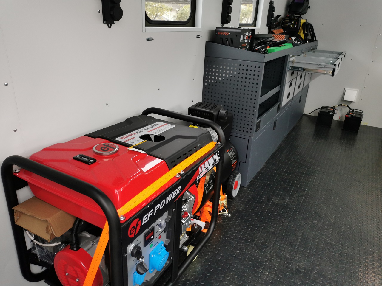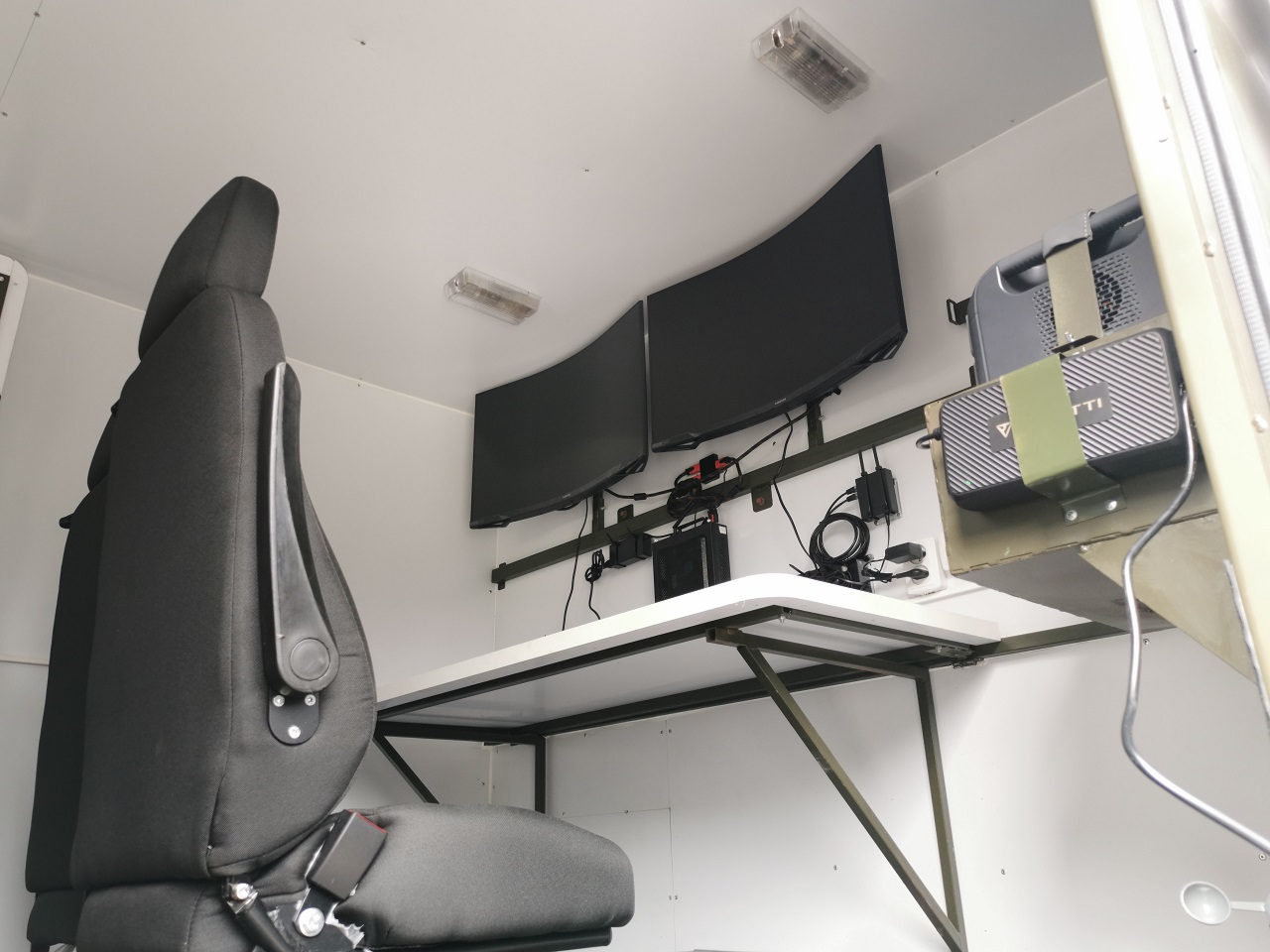 Поруч стояв і його спеціалізований варіант – машина управління БПЛА оперативно-тактичного рівня Poseidon H10 MKIII. Із запланованих на 2023 рік 30 од. для ЗСУ вже передано 21 од. Вартість одного комплексу – 13,8 млн. грн. Фургон обладнано автономним живленням, опаленням, генератором на 7,5 кВт. У комплектацію входить Starlink та монітори.