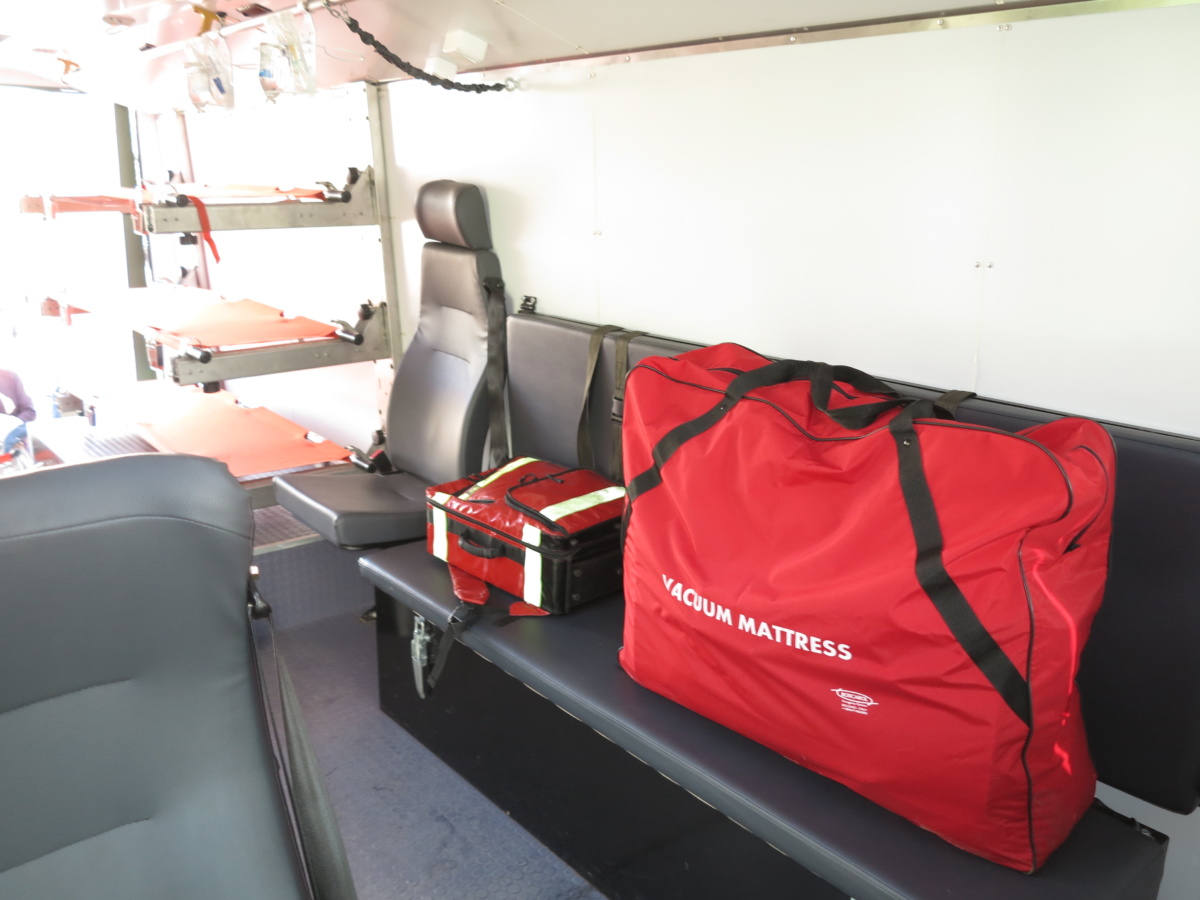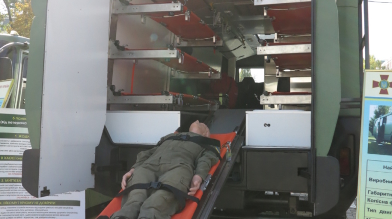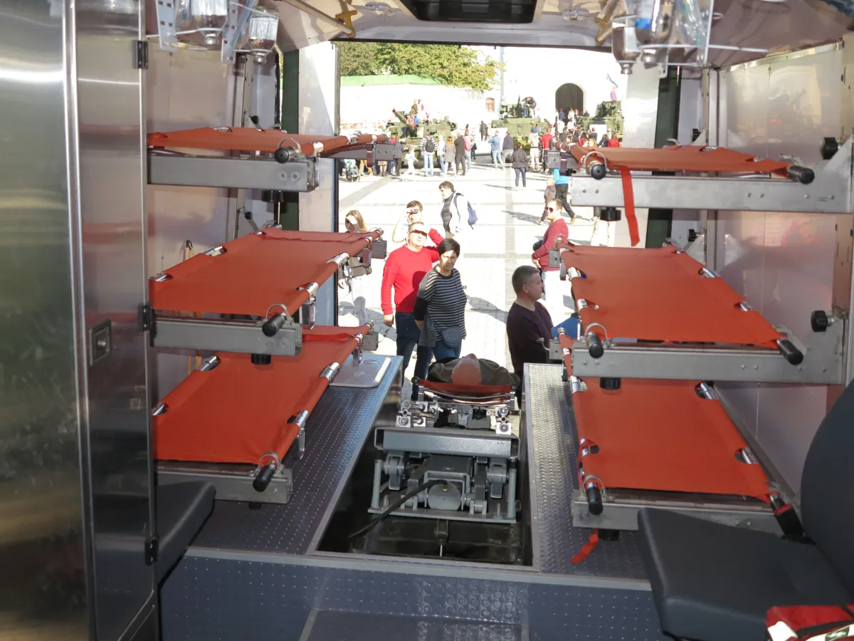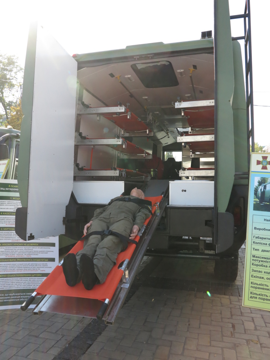 Машина представлена в санитарном варианте – с гидравлической системой погрузки носилок. Кузов автобуса сделан из композитных материалов. Высокую проходимость обеспечивает полноприводное шасси MAN TGM 13.240 (4х4).