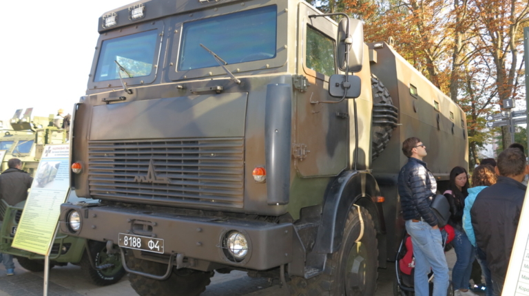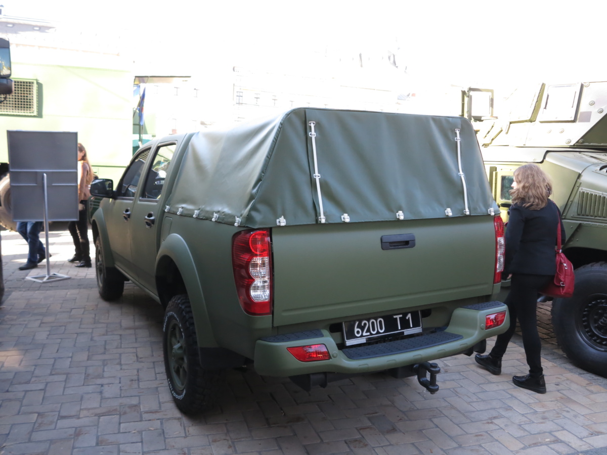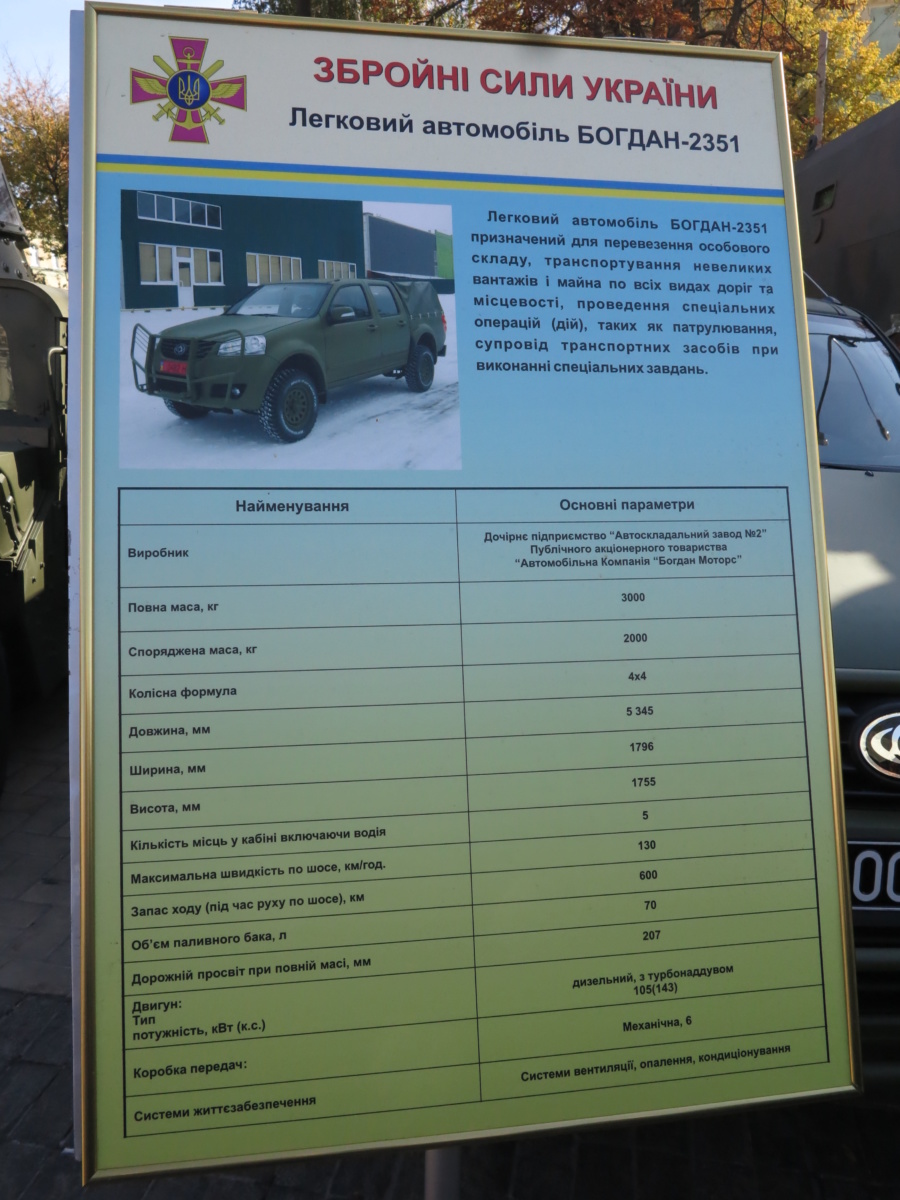 Армейские грузовики «Богдан» были представлены двумя моделями Богдан-МАЗ-6317 (6х6) – с бортовой платформой и бронемодулем , включая бронекабину. Также демонстрировался пикап Богдан-2351, а рядом с ним – бронированный Hummer.