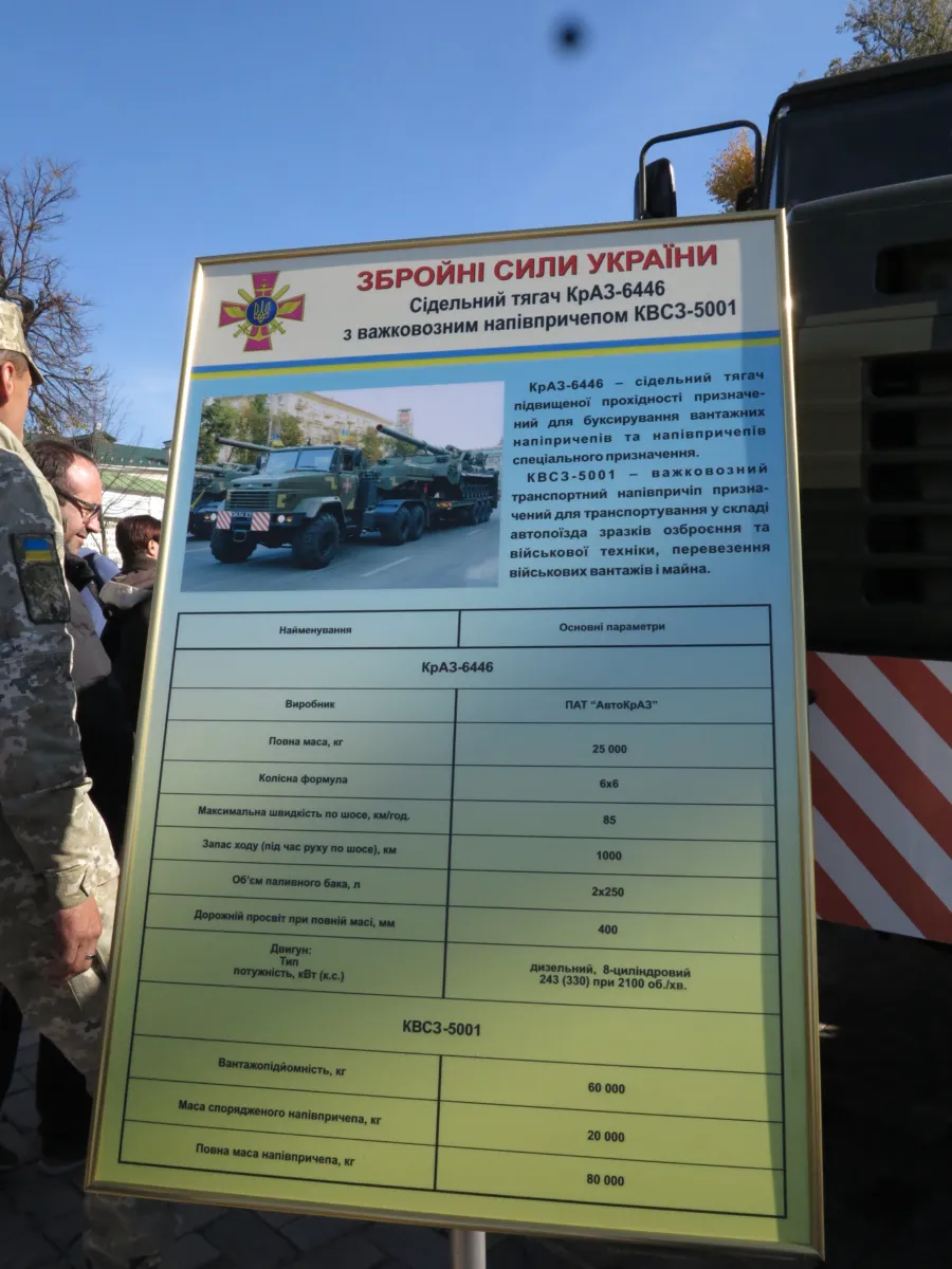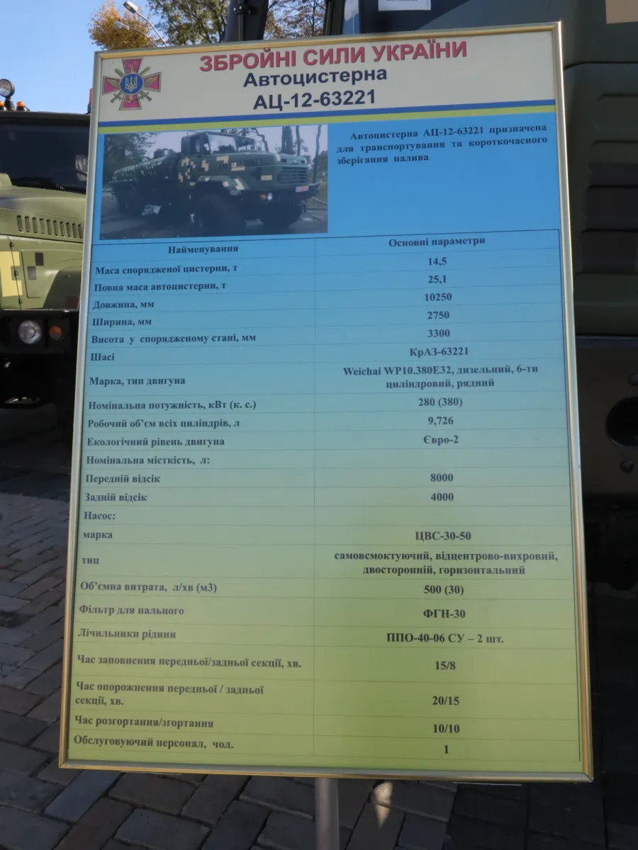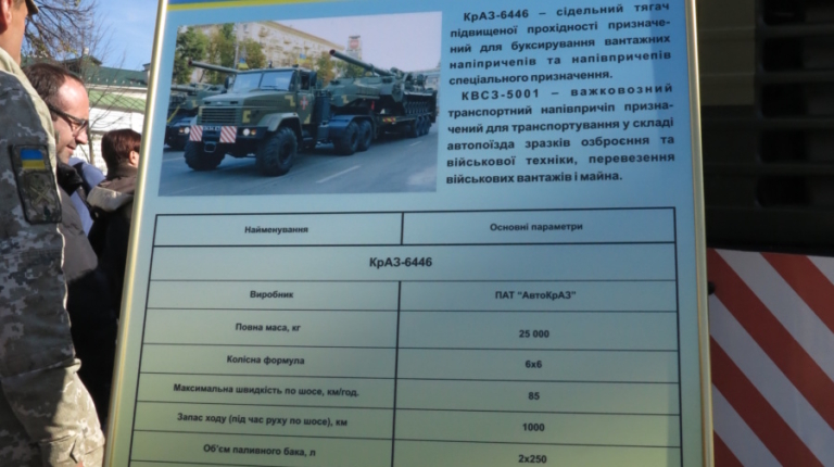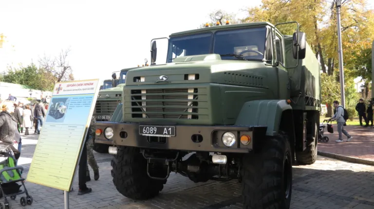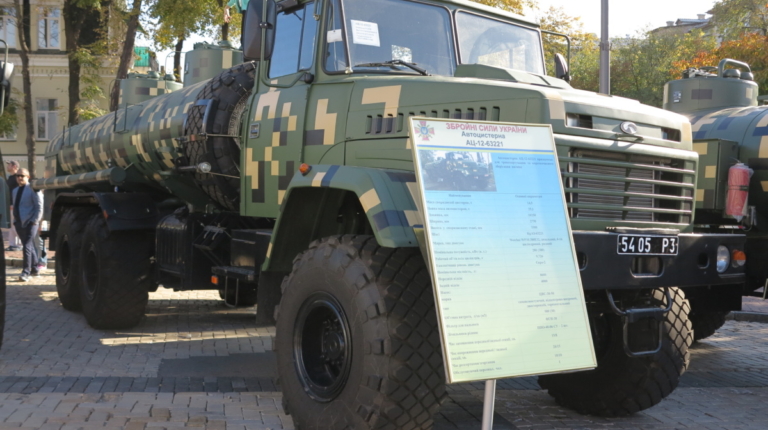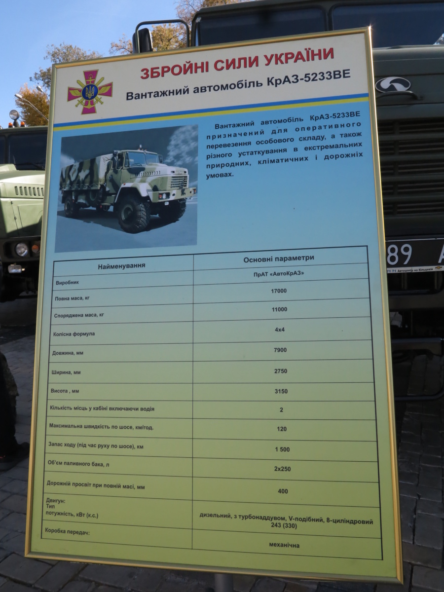 На выставке широко представлены и грузовики Кременчугского автозавода. Это популярный армейский автомобиль КрАЗ-6322 «Солдат» (6х6) и КрАЗ-5233 ВЕ(4х4) с бортовой тентованной платформой. А также автотопливозаправщик АПЗ-6,5-5233 и автоцистерна АЦ-12-63221.