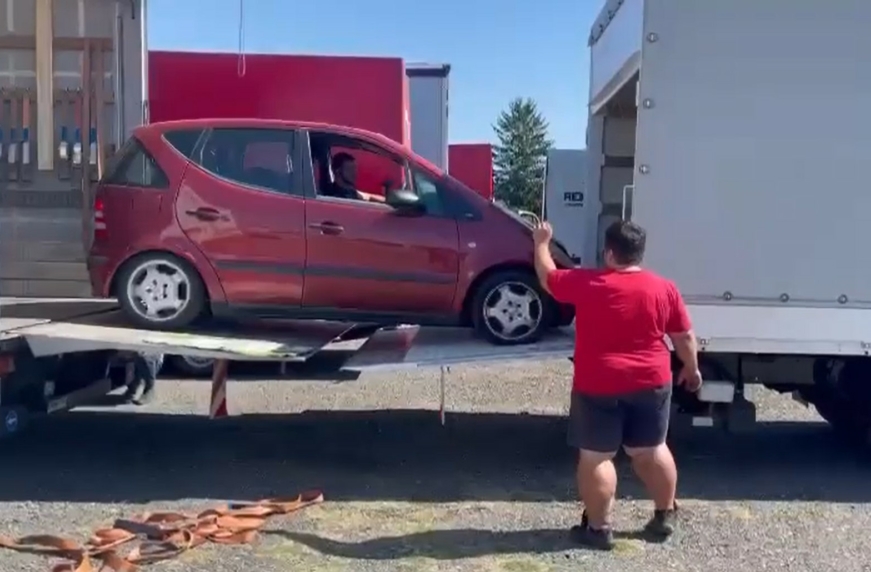 Здавалося б, що все закінчилося. Проте розслаблятись було ще зарано. З’ясувалося, що гідроборт передньої вантажівки не може «дотягтися» до землі. У результаті водієві Mercedes-Benz A-Class довелося ювелірно попрацювати акселератором, щоб машина не впала носом об асфальт. Платформу зрештою все ж таки опустили до потрібної висоти шляхом встановлення на неї імпровізованого баласту, функцію якого виконав важкий водій вантажівки.