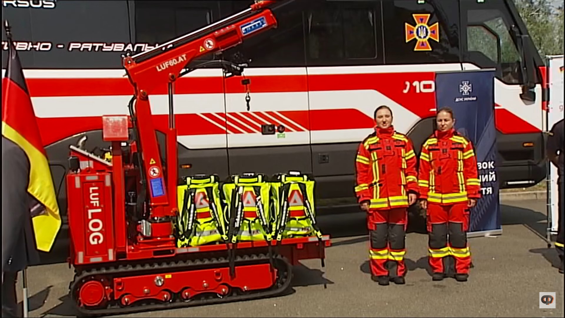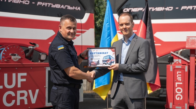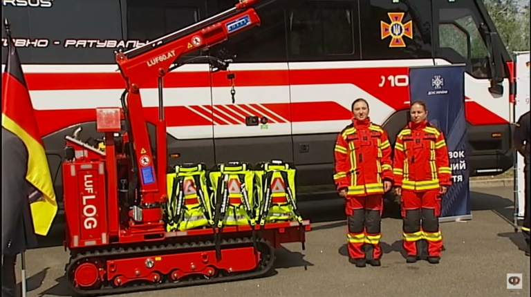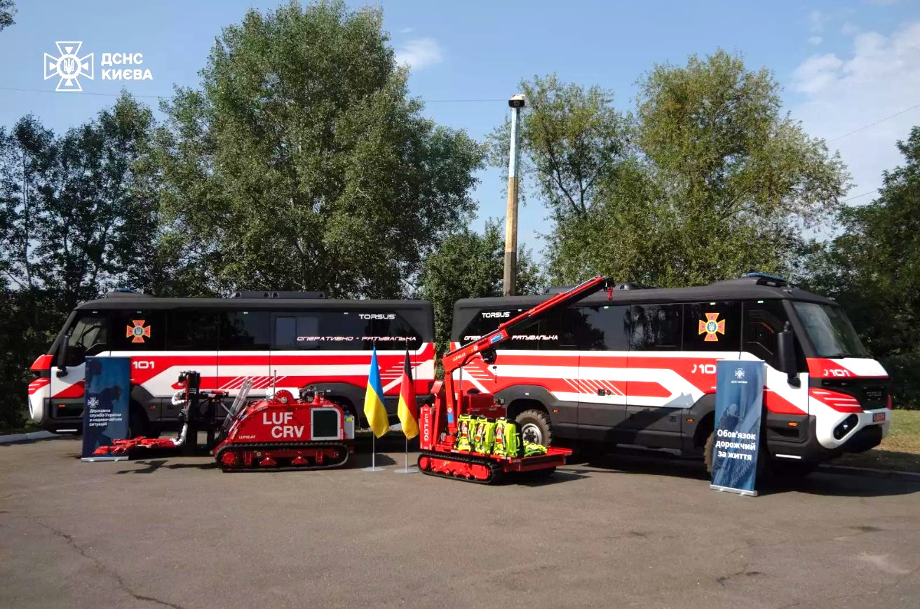 Це два позашляхові автобуси Torsus Praetorian у версії оперативно-рятувальних, а також дві роботизовані платформи LUF60АТ на гусеничному ходу: одна оснащена витягом для евакуації автомобілів, а інша – краном-маніпулятором. Крім того, було передано комплекти жіночого бойового одягу та сумки-рюкзаки для рятувальників.