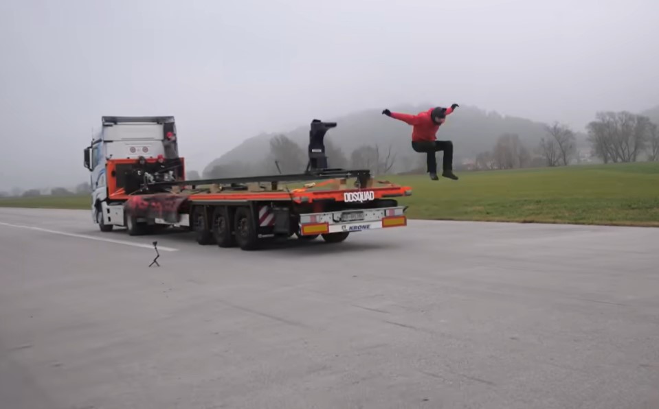 На ідею виконання цього неймовірного трюку команду DD Squad надихнув підручник з фізики. А суть експерименту полягала у накладенні рівних швидкостей об’єктів, що рухаються у протилежних напрямках. На напівпричепі встановили спеціальну рейкову систему з кріслом, яке могло розганятися до швидкості автопоїзда, тільки вже у зворотний бік. Людина в момент відриву від фури стає нерухомою відносно дороги, а тому може приземлитися точно на ноги, і при цьому не впавши.
