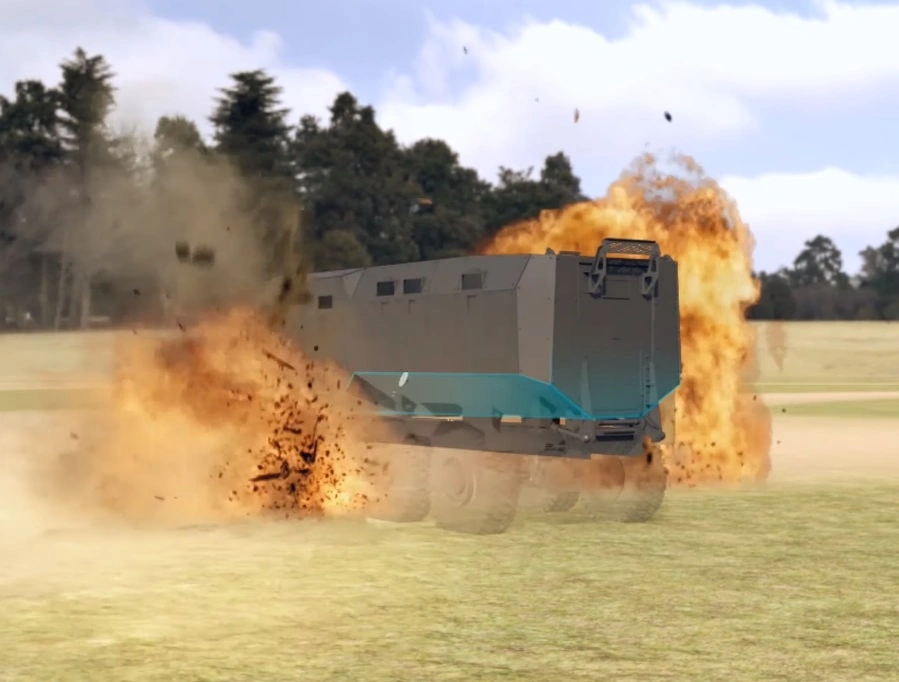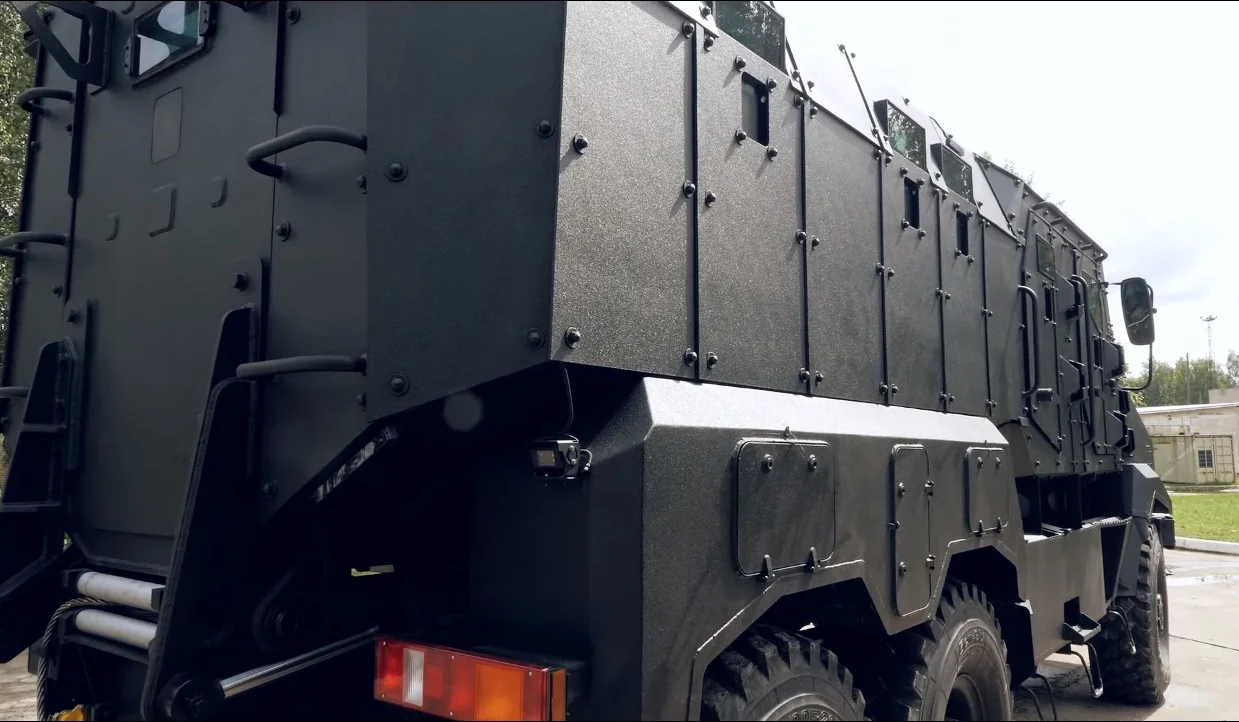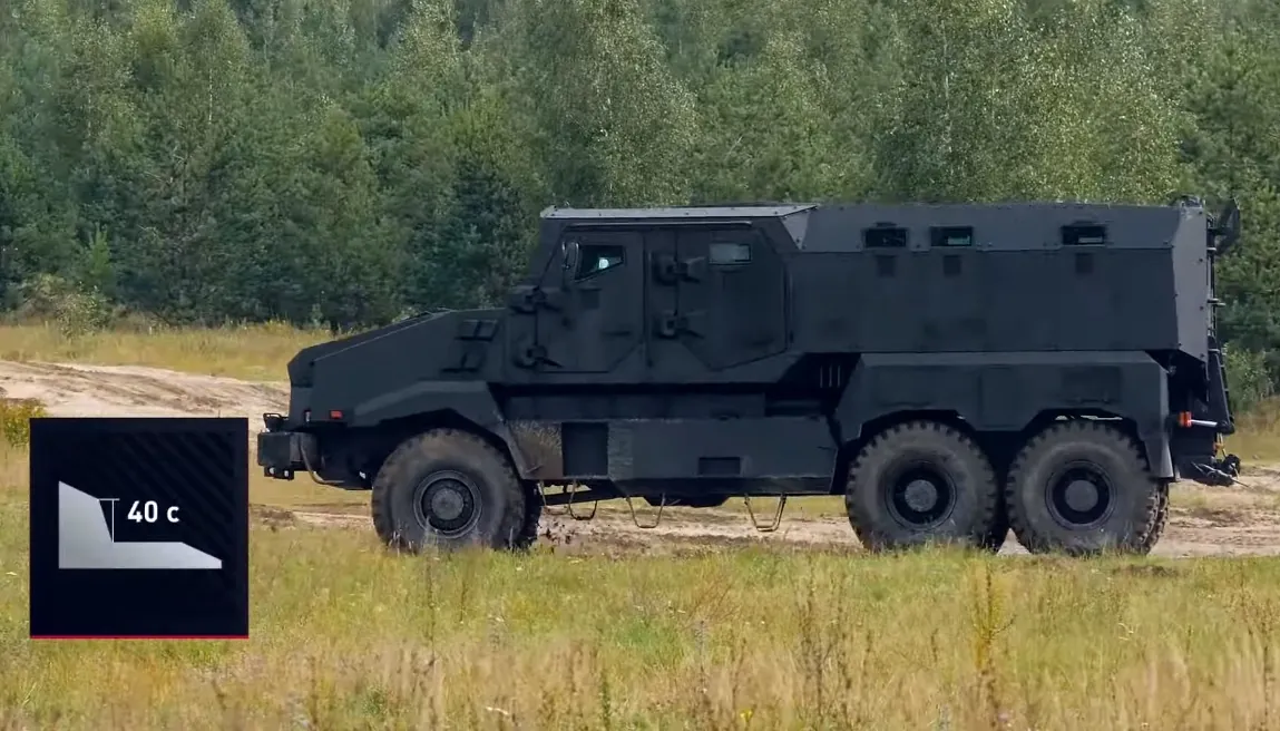 Днище V-образное, углы рассчитаны таким образом, чтобы отводить взрывную волну в стороны. Для повышения уровня защищенности личного состава внутри дополнительно установлена противоосколочная защита. Шины имеют пулестойкие вставки и оборудована централизованной системой контроля и давления.